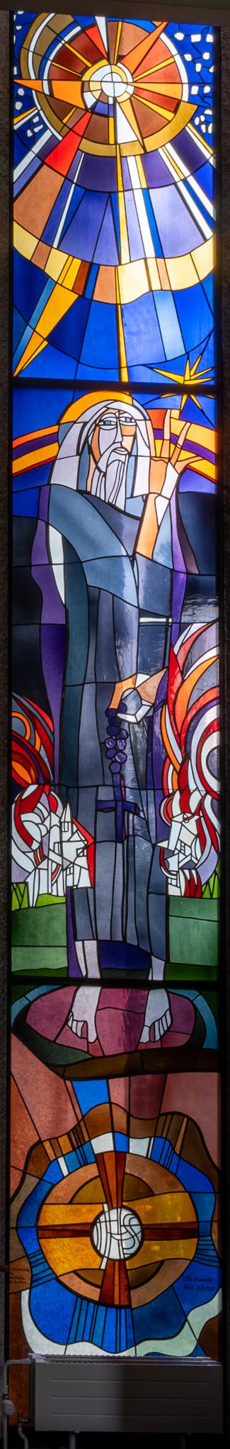 Im hochrechteckigen Fenster steht der Einsiedler Niklaus von Flüe vor der brennenden Stadt Sarnen. Diesen am 13. August 1468 ausgebrochenen Brand soll der Heilige mit einem Kreuzzeichen gelöscht haben. Niklaus hält in seiner Linken die Gebetsschnur und weist mit der rechten Hand auf einen Stern, eine seiner Visionen. Über ihm erscheint das Radbild, das im um 1488 entstandenen Pilgertraktat abgebildet ist und auf eine Skizze Niklaus von Flües zurückgeht. Am Scheibenfuss ist das eucharistische Brot, von dem sich der Eremit während zwanzig Jahren ernährt haben soll, dargestellt.