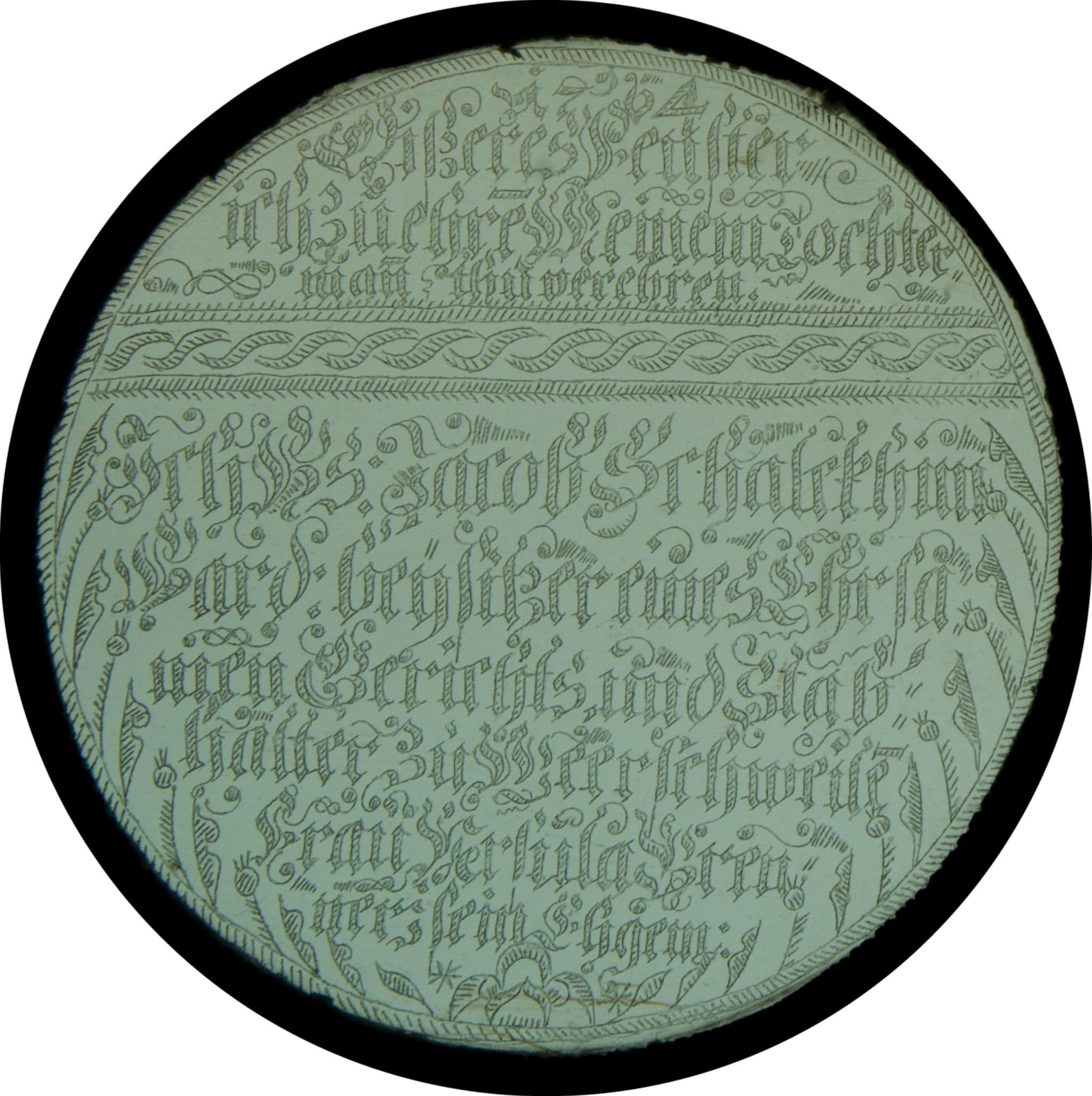 1764. Diesseres Fenster ich zu ehre Meinem Tochter man thu verehren. IchHs: Jacob Schalckh im hard: beysitzer eines Ehrsamen Gerichts und Stabhalter zu Weerschweile Frau Ursula Brenner sein Ehgem: