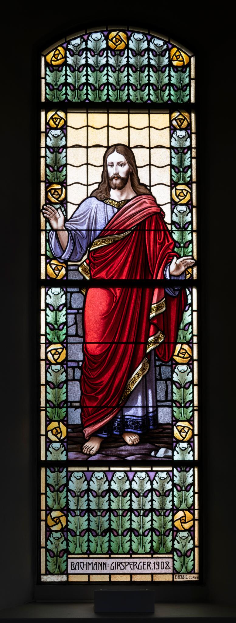 Vierteiliges Segmentbogenfenster mit der Ganzfigur des lehrenden Christus vor einer Steinmauer. Vegetabiles Jugendstil-Ornament (stilisierte Blätter und Blüten) im Bogenfeld, im Scheibenfuss und als Einfassung des figurativen Teils.