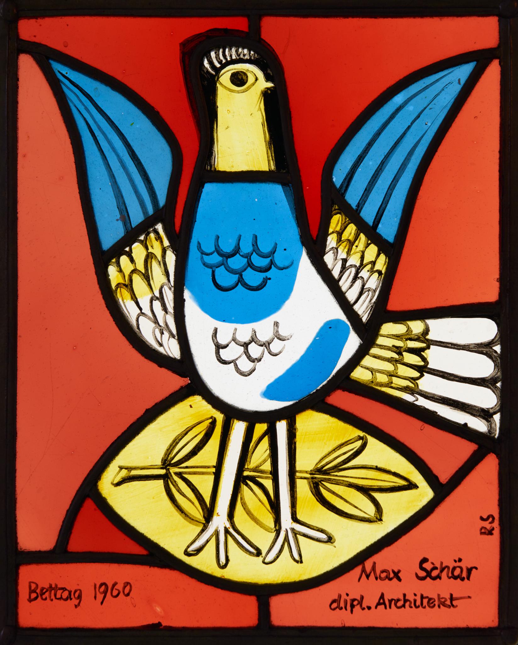 Der Künstler hat eine eher ungewöhnliche Lösung für den gewünschten Inhalt gefunden: Die Taube entspricht nicht dem gängigen Bild, nach welchem sie meistens im Flug und mit dem Zweig im Schnabel dargestellt wird. Es scheint beinahe, als ob sich die Taube nach dem Loslassen des Olivenzweigs gerade niedergelassen hätte und die Flügel im nächsten Moment an den Körper legen würde. Auch farblich geht Schär ungewohnte Wege: Die üblicherweise weisse Taube ist mehrheitlich blau und gelb; die Farbe Weiss erkennt man nur am Bauch, den Schwanzfedern und am Flügelansatz. Kompositorisch nimmt das am Kopf vorkommende und daher prominente Gelb die Hauptfarbe des Glasstücks mit dem Zweig auf. Die mit Schwarzlot eingezeichneten und stark vereinfachten Federn sowie die stilisierte Kopfform verleihen der Friedenstaube einen insgesamt verspielten Eindruck.