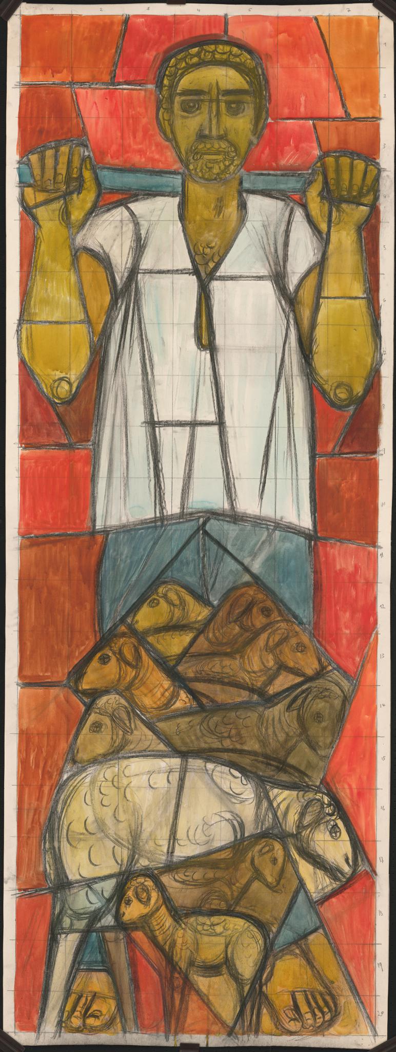 Ein erhaltener Entwurf im Privatbesitz zeigt den Guten Hirten im Massstab 1:5. Der zweite, im Massstab 1:1 entstandene Entwurf kam im Jahr 2020 als Teil der Schenkung von Max Schär und Maria Katarina Chrysomali-Schär ans Vitromusée Romont.