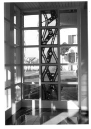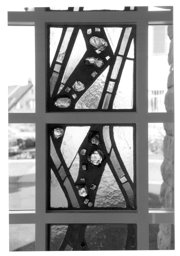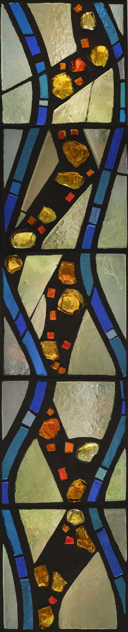 Vertikale Betonverglasung aus fünf quadratischen Elementen: Zwei blaue, parallele Bänder ziehen sich wellenförmig von oben nach unten durch die fünf Elemente. Die schmalen Bänder sind aus Dallglasstücken in verschiedenen Blautönen zusammengesetzt. Sie heben sich vor einem hellen Hintergrund ab. Zwischen den Bändern sind breite Fugen aus Waschbeton gesetzt, die mit kristall- und stiftförmig zugeschlagenen Dallglasstücken in Gelb, Orange und Rot besetzt sind. Die wellenförmige Komposition könnte symbolisch auf den ehemaligen Standort in der Raiffeisenbank Goldach verweisen. Eine Stadt für die der Fluss Goldach, ein Zufluss des Bodensees, namensgebend ist.