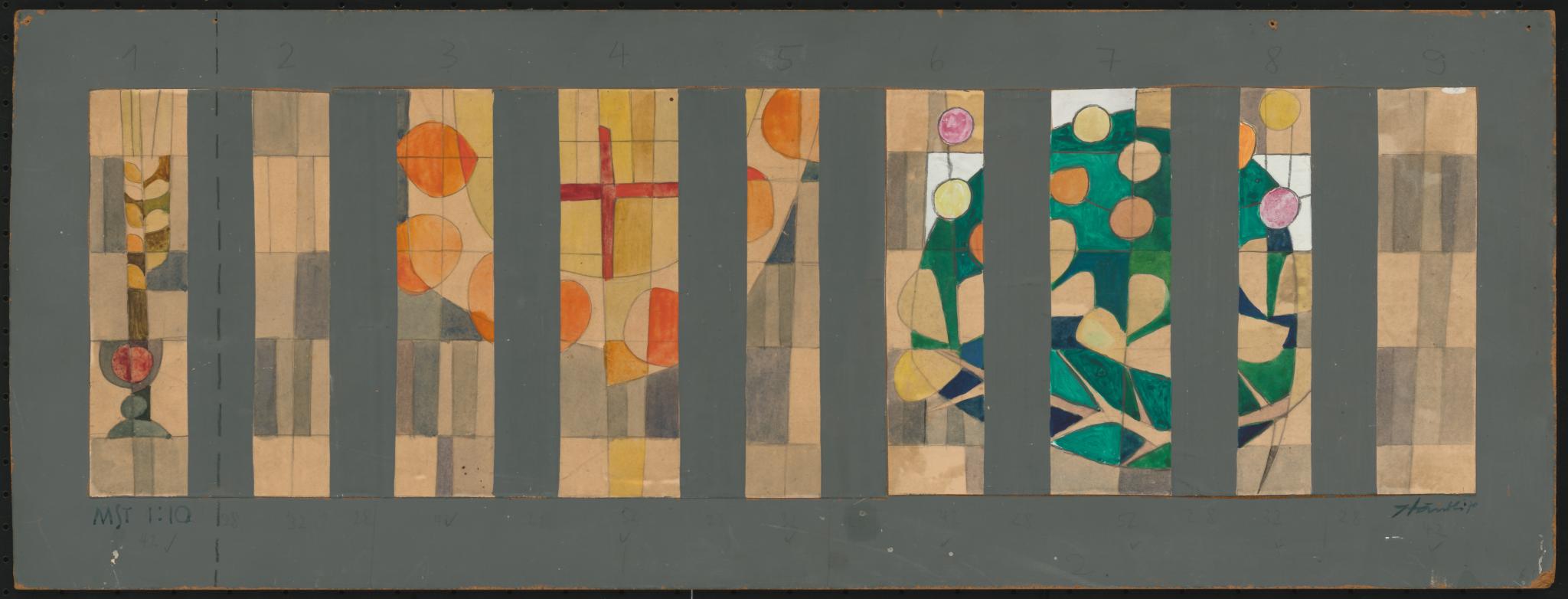 Entwurf für eine neunteilige Glaswand mit grau-bläulicher Ornamentverglasung und vier farbigen Darstellungen. Im ersten Fensterfeld eine Getreideähre und ein Kelch mit Wein als Symbole der Eucharistie. Im Zentrum der Wand ein rotes Kreuz in einer Lichtkugel mit grossen orangefarbenen Punkten. Daneben schwebt eine grüne Kugel, wie ein Erdball mit Dornenkranz, umgeben von Punkten und Blätterformen. Oberhalb der Erdkugel wurde der Entwurf ausgebessert.