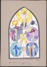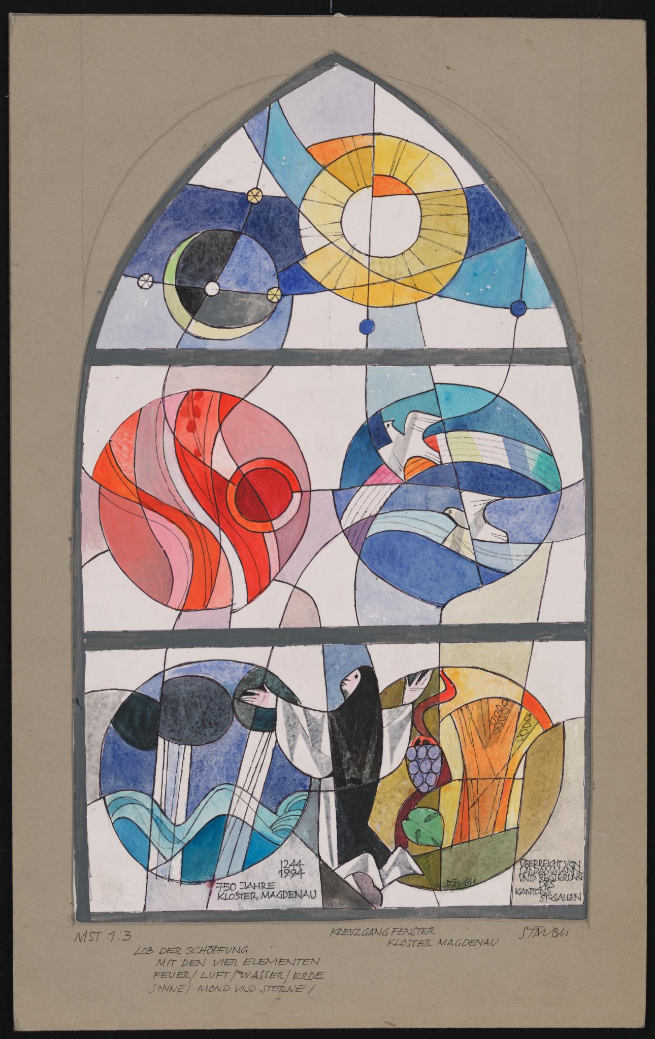 Entwurf für ein Spitzbogenfenster mit Darstellungen der vier Elemente in Kreisformen, von links oben Feuer (rote Wellen und Sonne), Wind (Regenbogen mit zwei weisse Tauben im Flug), Wasser (schwarze Regenwolken, Regen und Fluss) und Erde (Getreide, Weinrebe in Gelbtönen). Zwischen Wasser und Erde eine kniende Schwester im rückseitigen Dreiviertelprofil, die ihre Hände zum Gebet erhoben hat. Im Fensterscheitel die Darstellung eines Sichelmondes und einer kreissrunden gelben Sonne mit weissem Kern, darum Sterne.