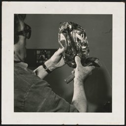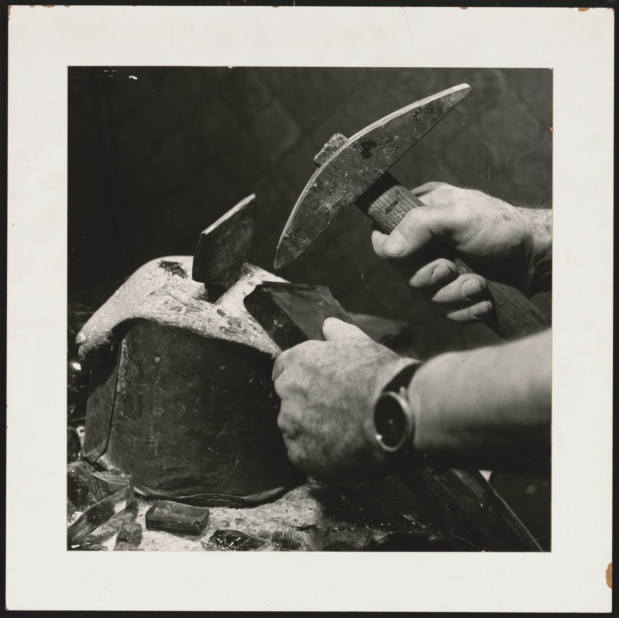 Grossformatige Schwarzweissfotografie, die die Hände von Heinrich Stäubli beim Zuschlagen einer Dallglasplatte zeigen. Der Künstler hat die dicke Gussglasplatte auf einen Amboss gelegt, hält diese mit der linken Hand fest und führt in der rechten Hand den Hammer. Rings um den Amboss liegen Dallglasstücke und feine Glassplitter. Der hier dargestellte Moment des Hammerschlags wurde bewusst angehalten, um eine scharfe Momentaufnahme abzubilden.
