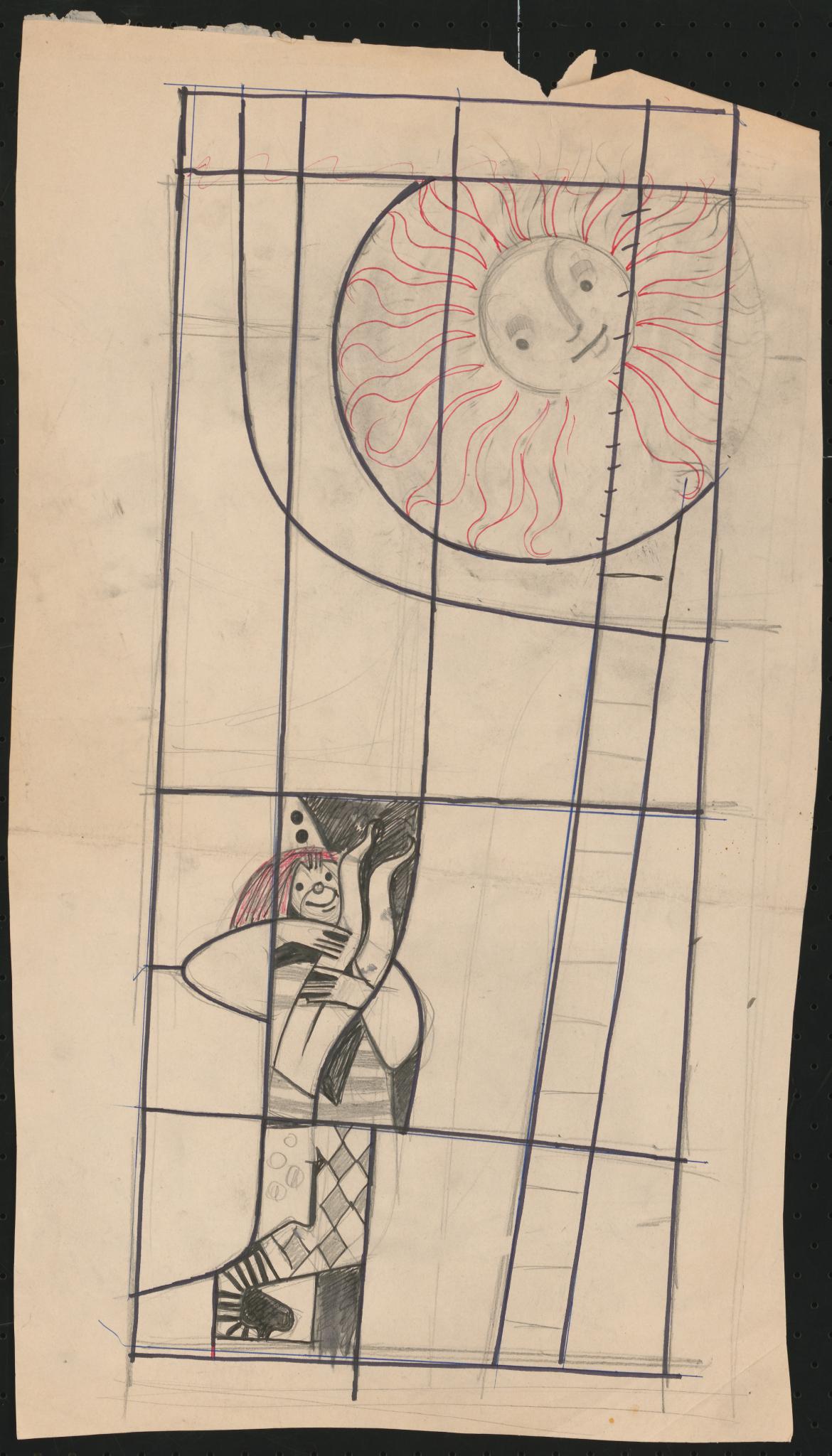 Möglicherweise handelt es sich bei dieser Zeichnung um eine (thematisch) vorbereitende Studie für eine Metallglasskulptur, die der Künstler und Glasmaler Heinrich Stäubli für den Kindergarten in Abtwil SG ausführte (HS_1044).