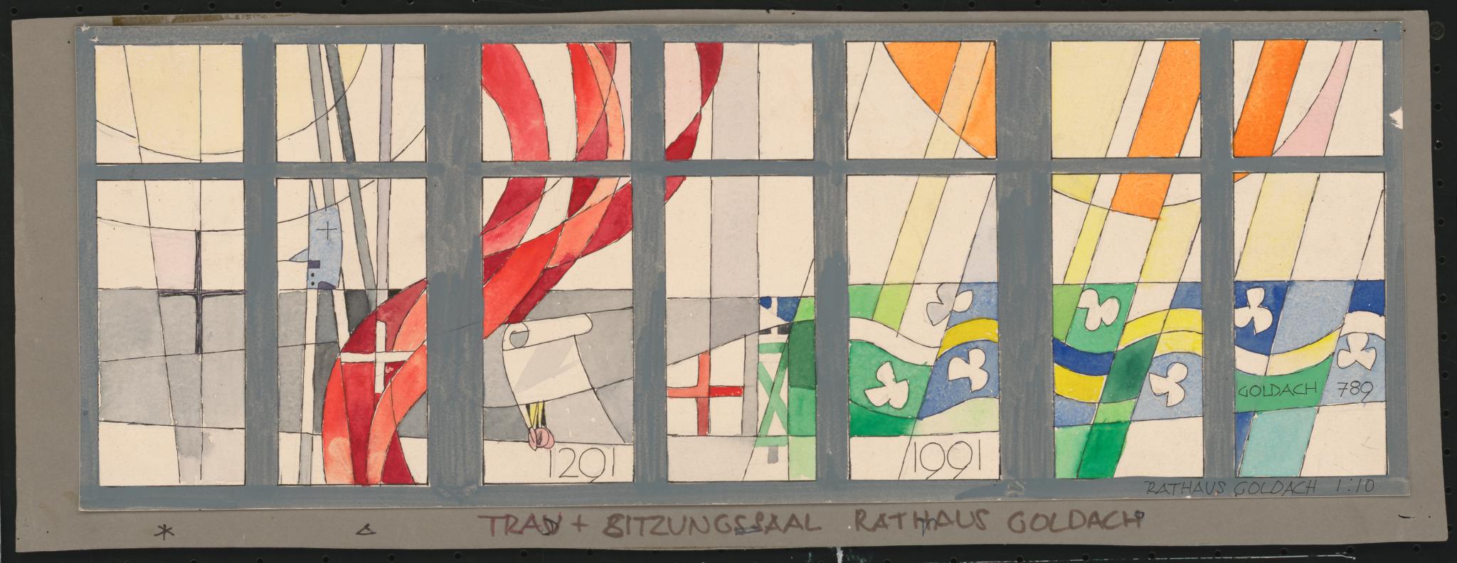Entwurf eines Fensterzyklus für den Trau- und Sitzungssaal des Rathauses Goldach SG. Er zeigt eine Fensterverglasung aus sieben quadratischen und sieben hochrechteckigen Scheiben, wobei je ein Quadrat und ein Rechteck einen Fensterabschnitt bilden. Der Entwurf thematisiert das 700-jährige Jubiläum der Schweizerischen Eidgenossenschaft, symbolisiert durch die Hellebarde, das Schweizer Kreuz auf rotem Banner und den Bundesbrief in der linken Bildhälfte. Die rechte Bildhälfte ist Goldach im Kanton St. Gallen gewidmet, das St. Galler Bündel mit Beil, daneben die abstrahierte Darstellung von Sonne und Sonnenstrahlen, grüner Landschaft, Blumen und Wasser. Die Jahreszahl 789 verweist auf die erste urkundliche Erwähnung von Goldach.