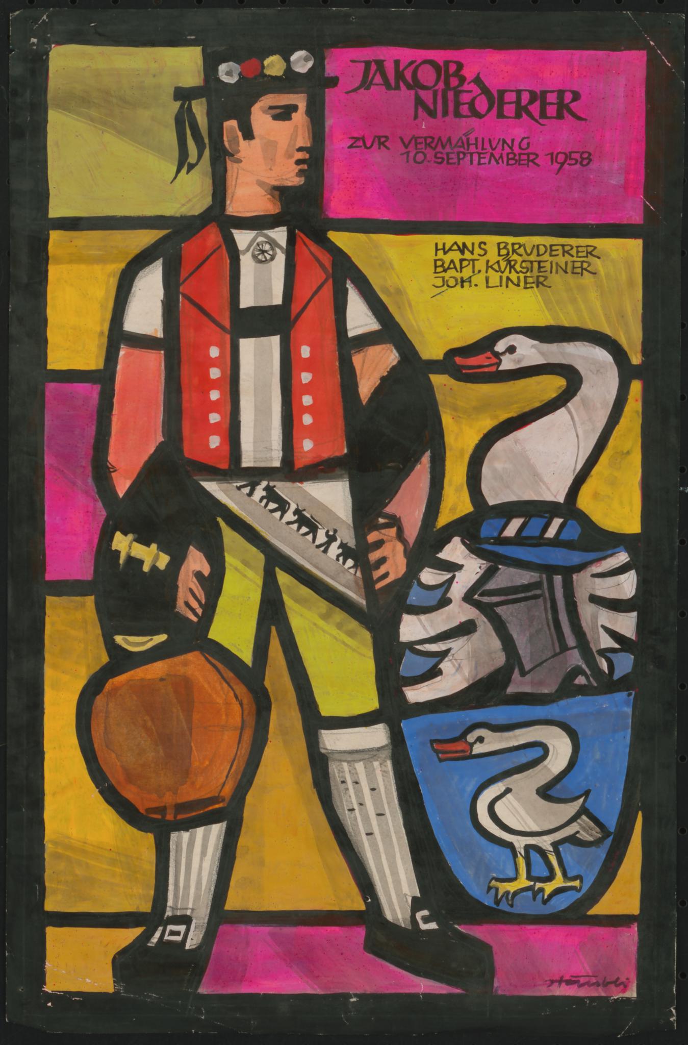 Die farbige Zeichnung zeigt einen jungen Mann in Appenzeller Sennen-Festtagstracht (mit gelber Lederhose und Sennenfetzen um den Bund) und mit einer grossen Kuhglocke am linken Arm. Rechts neben ihm ist das Vollwappen Niederer dargestellt.
