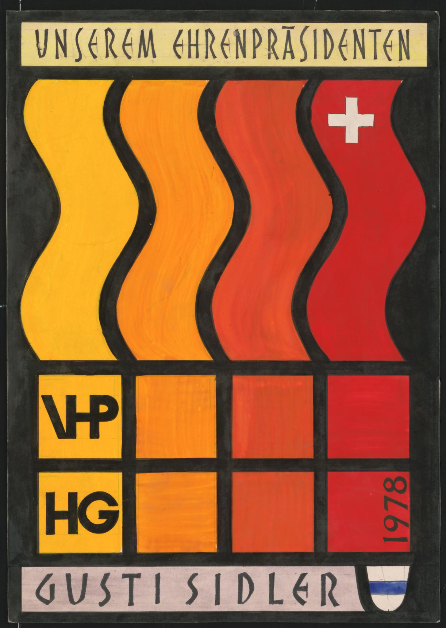 Vier senkrechte Wellenbalken im Farbverlauf von Gelb bis Dunkelrot stehen im Zentrum; der letzte dunkelrote Balken trägt das weisse Schweizer Kreuz. Die vier Balken gehen in vier mal zwei Quadrate in den entsprechenden Farben über. Die Akronyme VHP (Verband Schweizerischer Hafner- und Plattengeschäfte) und HG (Handelsgenossenschaft oder Hafnergesellschaft o.ä.) sind in die ersten zwei gelben Quadrate eingesetzt. Möglicherweise symbolisieren die Quadrate auch zwei Reihen Fliesen in Anspielung auf den gewerblichen Interessenverband. Am oberen und unteren Rand die Stifterinschrift mit dem Wappenschild des Kantons Zug in der rechten unteren Ecke.