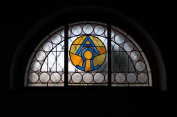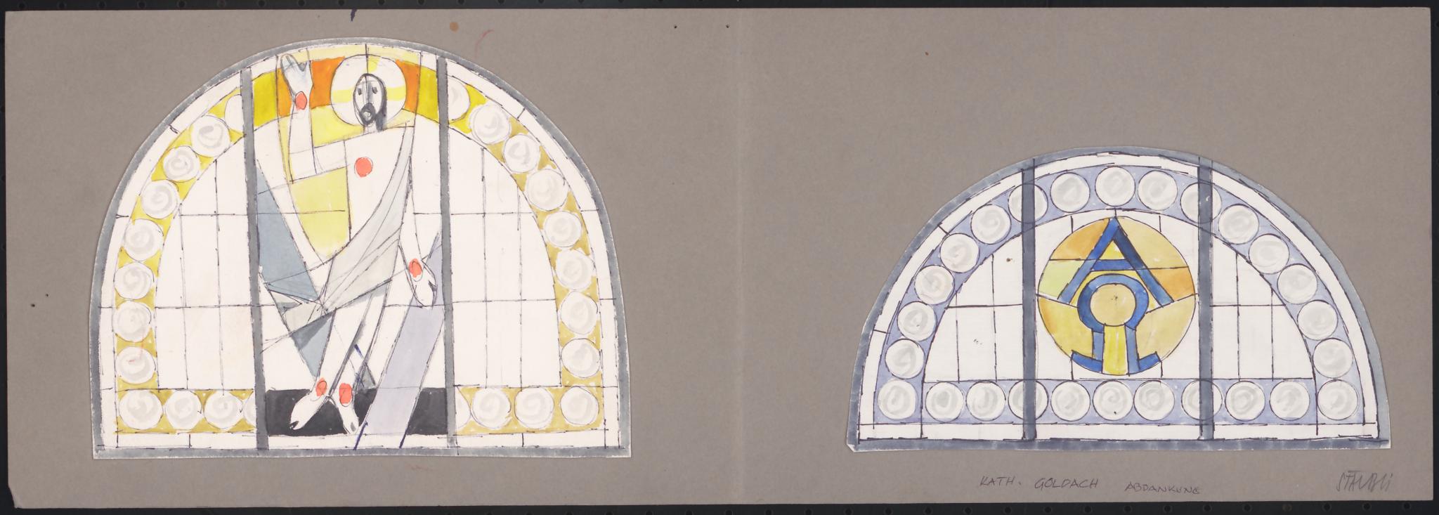 Entwurf für zwei verschieden grosse Rundbogenfenster mit der Auferstehung Christi und dem Christusmonogramm Alpha und Omega. Beide Fenster sind mit einem umlaufenden breiten Ornamentband aus weissen Kreisen auf gelbem bzw. violettem Grund versehen.