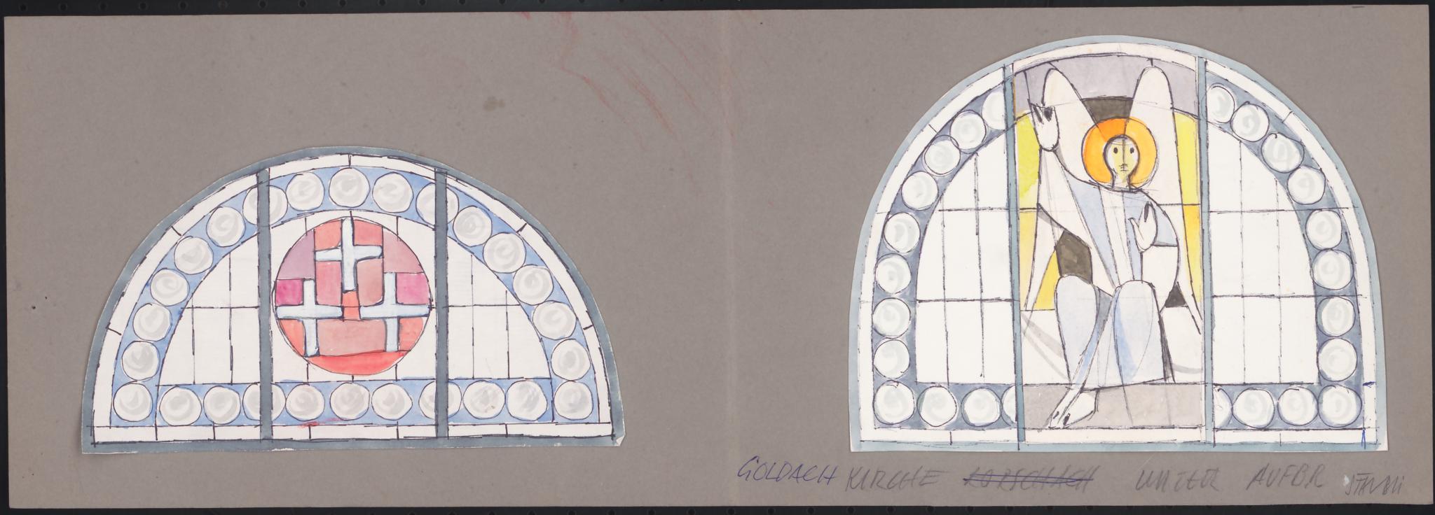 Entwurf für zwei verschieden grosse Rundbogenfenster mit den drei Kreuzen auf dem Hügel Golgatha und dem Engel, der die Auferstehung Christi verkündet. Beide Fenster sind mit einem umlaufenden breiten Ornamentband aus weissen Kreisen auf blauem bzw. grauem Grund versehen.