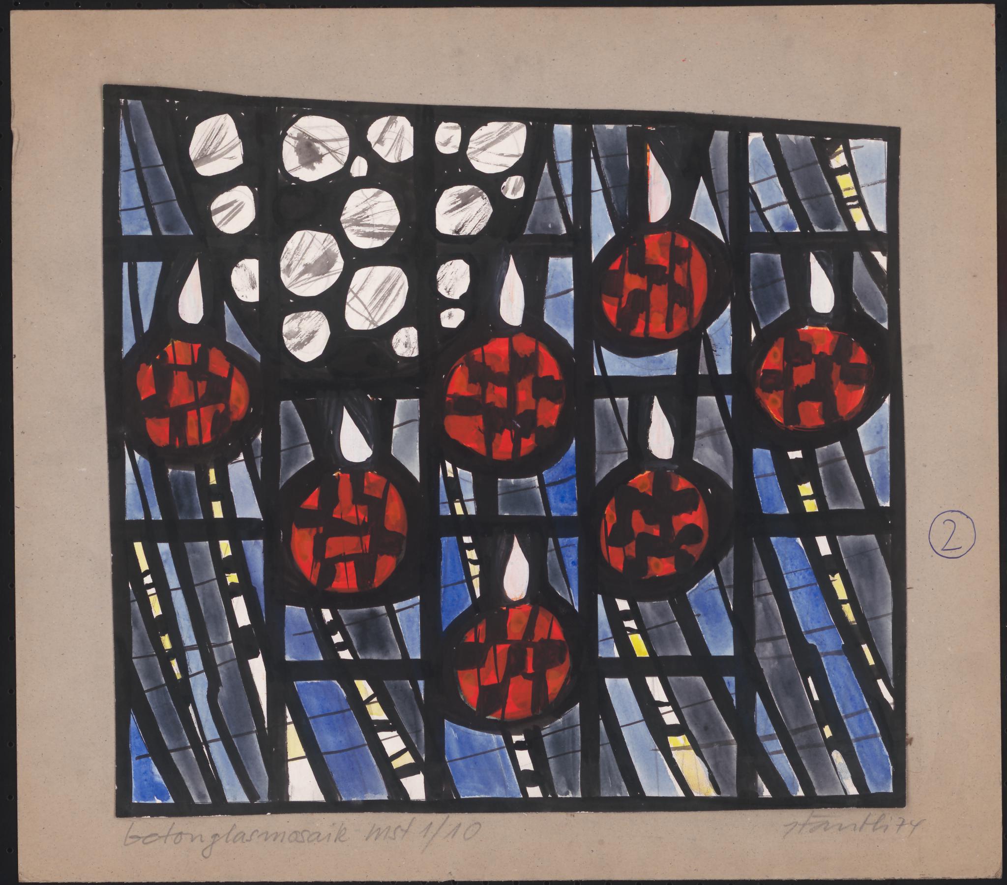 Entwurf für eine trapezförmige Betonglaswand: Vor einem in grau-blauen und gelben Bahnen verlaufenden Hintergrund sind sieben rote Kreise mit Tropfen oder Flammen gesetzt. Sie symbolisieren möglicherweise die (brennenden) Wunden Christis, auf die Öl getropft wird. In der linken oberen Bildhälfte eine Anhäufung von kristallförmig zugeschlagenem Dallglas (weisse Fläche mit blassen schwarzen Aquarelllinien).