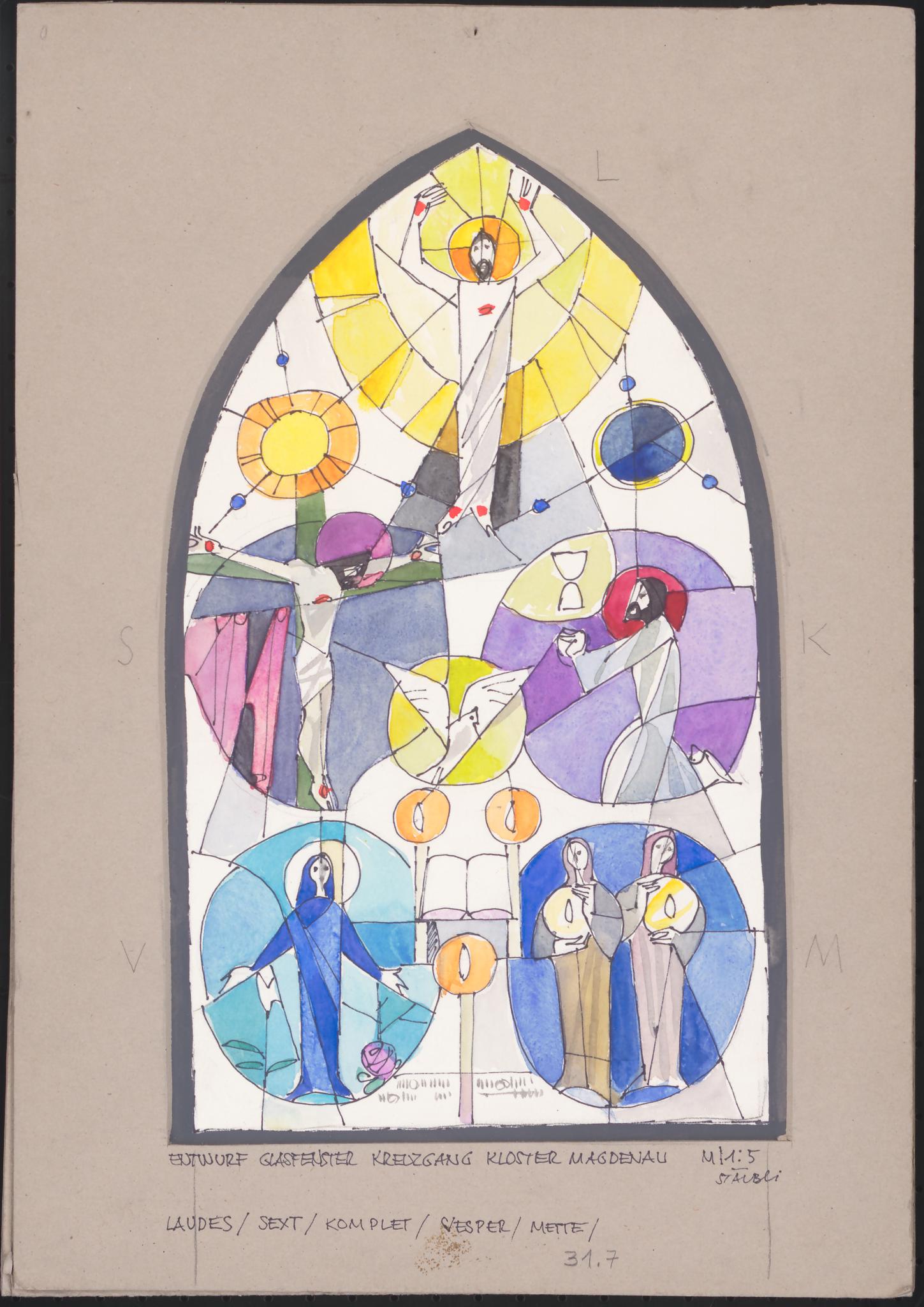 Entwurf für ein Spitzbogenfenster mit fünf Szenen des Stundengebets. Von oben: Christus als Auferstandener vor aufgehender Sonne (Laudes) im Scheitel, darunter Sonne und Mond. Christus am Kreuz (None), btender Christus mit rosafarbenem Nimbus und Kelch (Sext), stehende Maria mit Nimbus, daneben Lilie und Rose (Komplet) und zwei wachende weibliche Gestalten mit Kerzenlicht (Virgil, Mette). In der Mitte der vier kreisförmigen Darstellungen die Taube in goldenem Nimbus (Heiliger Geist; Terz), drei brennende Kerzen und ein aufgeschlagenes Buch.