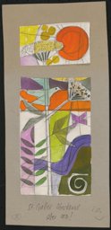 Farbiger Entwurf für ein zweiteiliges Fenster im Altersheim Allmend, Bad Ragaz SG. Der Entwurf zeigt im Zentrum ein Kreuz, das zwischen den roten Buchstaben A (Alpha) und Ω (Omega) in einer Kreisform steht. Der Kreis wird umgeben von zweireihigen beblätterten Zweigen. Sie streben der im oberen Fensterfeld stehenden orangefarbenen Sonne auf weissem Grund entgegen.