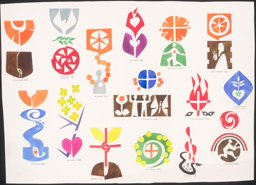 Die Collage zeigt diverse Osterkerzensignets und Symbole der Jahresthemen von Kirchgemeinden (St. Otmar, Riethüsli) wie auch von Volksmissionen, Frauen und Mütter-Vereinen und Jungwachten im Kanton St. Gallen. Die Motive sind in der Regel abstrahiert und nehmen Bezug auf die christliche Ikonografie (Kreuz, Wein als Blut Christi, Taube). Die Signets und Symbole oder Logos datieren aus den Jahren 1979 bis 1986 und wurden vermutlich nachträglich in dieser Collage zusammengeführt.