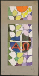 Der Entwurf zeigt von oben eine orangefarbene Sonne auf weissem Grund, zwei stilisierte Blütendolden, einen Vogel im Flug, darunter einen Flussverlauf zwischen Vegetation und in der rechten unteren Ecke eine schwarz-weisse Spirale.