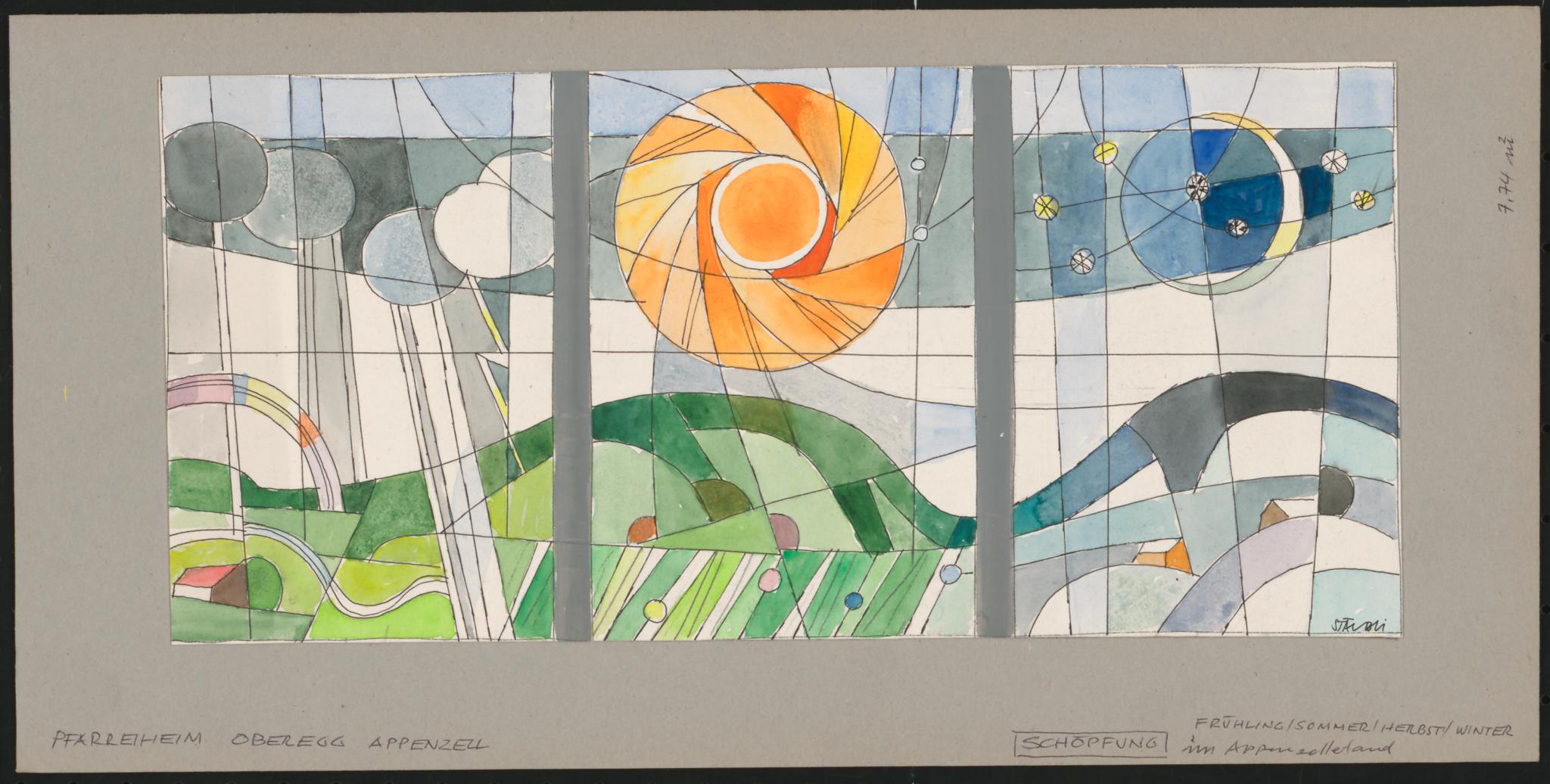 Farbiger Entwurf für ein dreiteiliges Fenster mit der Darstellung der Schöpfung für das Pfarreiheim Oberegg in Appenzell, das «Frühling/Sommer/Herbst/Winter im Appenzellerland» zeigt. In der oberen Bildhälfte finden sich Wolken, aus denen Regengüsse und Blitze hervorbrechen. Im Zentrum steht die Sonne in sattem Orange-Gelb, deren Form an die lamellenartige Blende eines Fotoapparats erinnert. Links daneben hängt der Sichelmond, begleitet von kleinen weissen und hellgelben Punkten, die Sterne darstellen. In der unteren Bildhälfteindet sich ein Flussverlauf, eingebettet in eine sanft geschwungene, hügelige Landschaft in kräftigen Grün-, wie auch winterhaften Blautönen. Das hier mit Kugelschreiber eingezeichnete Bleinetz tritt stark in den Hintergrund. Es legt sich zart über das Bild und gliedert den Bildraum.