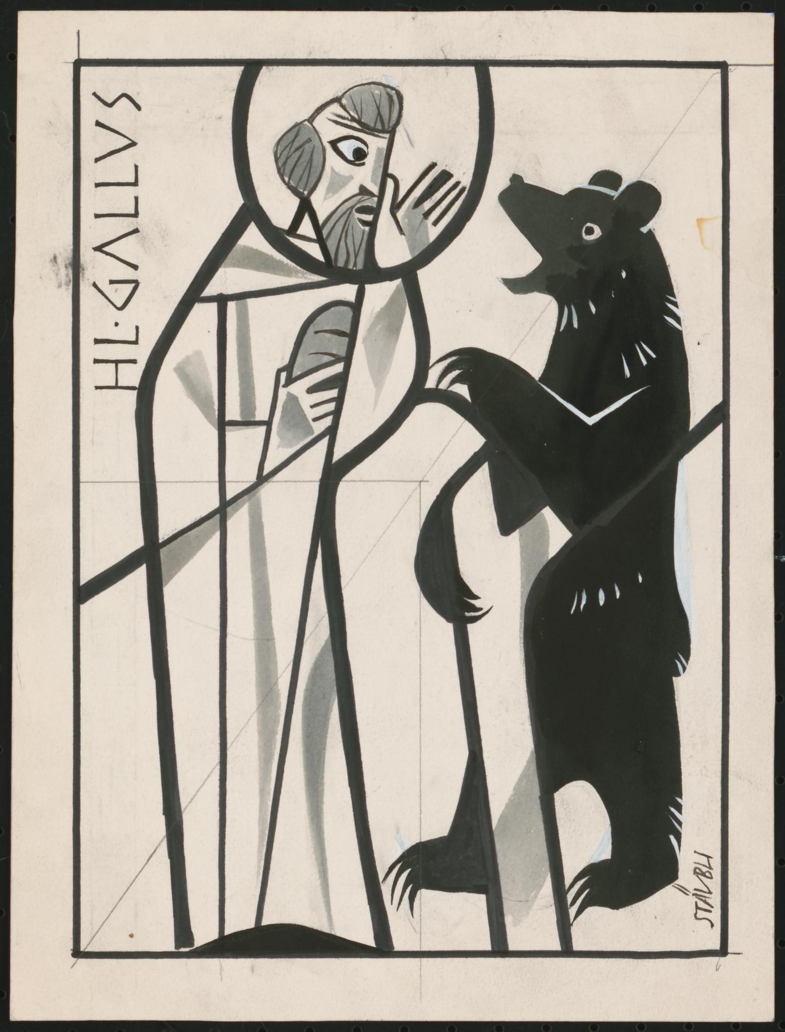 Als Schutzpatron der Stadt und des Bistums St. Gallen ist die Figur des heiligen Gallus ein wiederkehrendes Motiv im Werk von Heinrich Stäubli (siehe auch HS_131). Dieselbe Anordnung der Figuren (Heiliger und Bär) setzte Stäubli in einer Figurenscheibe der Fensterverglasung im Rathaus Goldach um (HS_1065). Der vorliegende Entwurf diente jedoch nicht als direkte Vorlage.