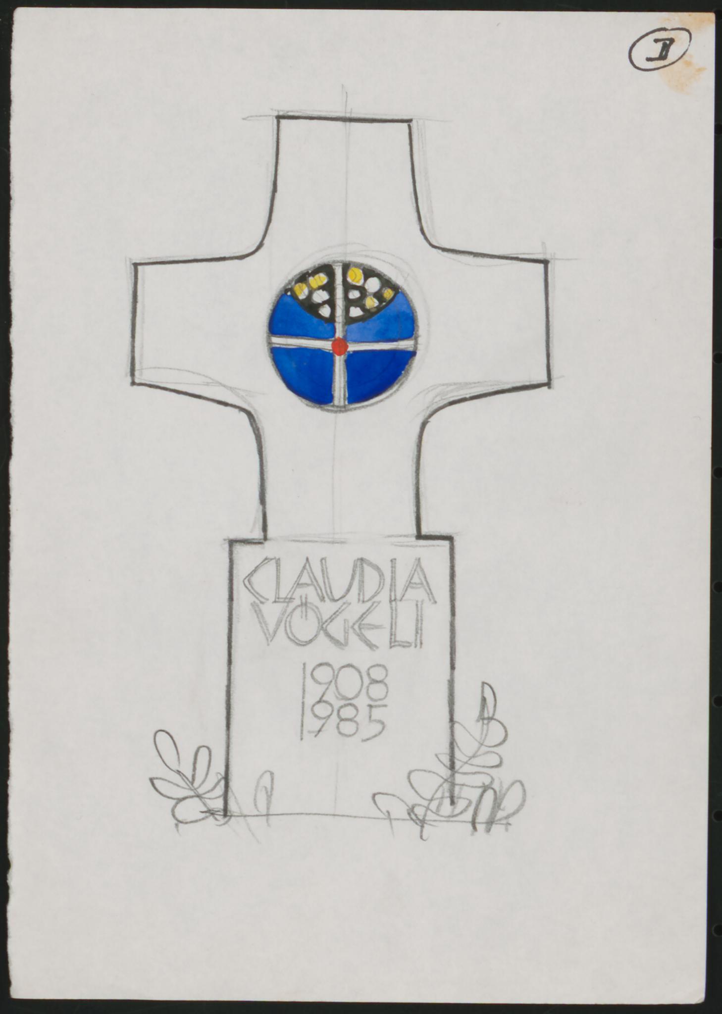 Die runde Betonverglasung in Gelb, Rot und Blau fungiert als leuchtendes Zentrum und Akzent der kreuzförmigen Grabmalplastik. Ein anderer Entwurf im Nachlass von Heinrich Stäubli zeigt eine Variation (E) des kreuzförmigen Grabsteins für Claudia Vögeli mit einer überwiegend in Rot gehaltenden Betonverglasung. Ob dieser Grabstein ausgeführt wurde, ist nicht bekannt. Heinrich Stäubli gestaltete einige Grabsteine für Freunde und Nachbarn, die heute nachweislich auf dem Friedhof in Abtwil und Engelburg stehen. Geschickt integriert der Glasmaler Dallglas, die Technik der Betonverglasung oder auch farbige Glasmosaiksteine und arbeitete dafür mit verschiedenen regionalen Bildhauern zusammen.