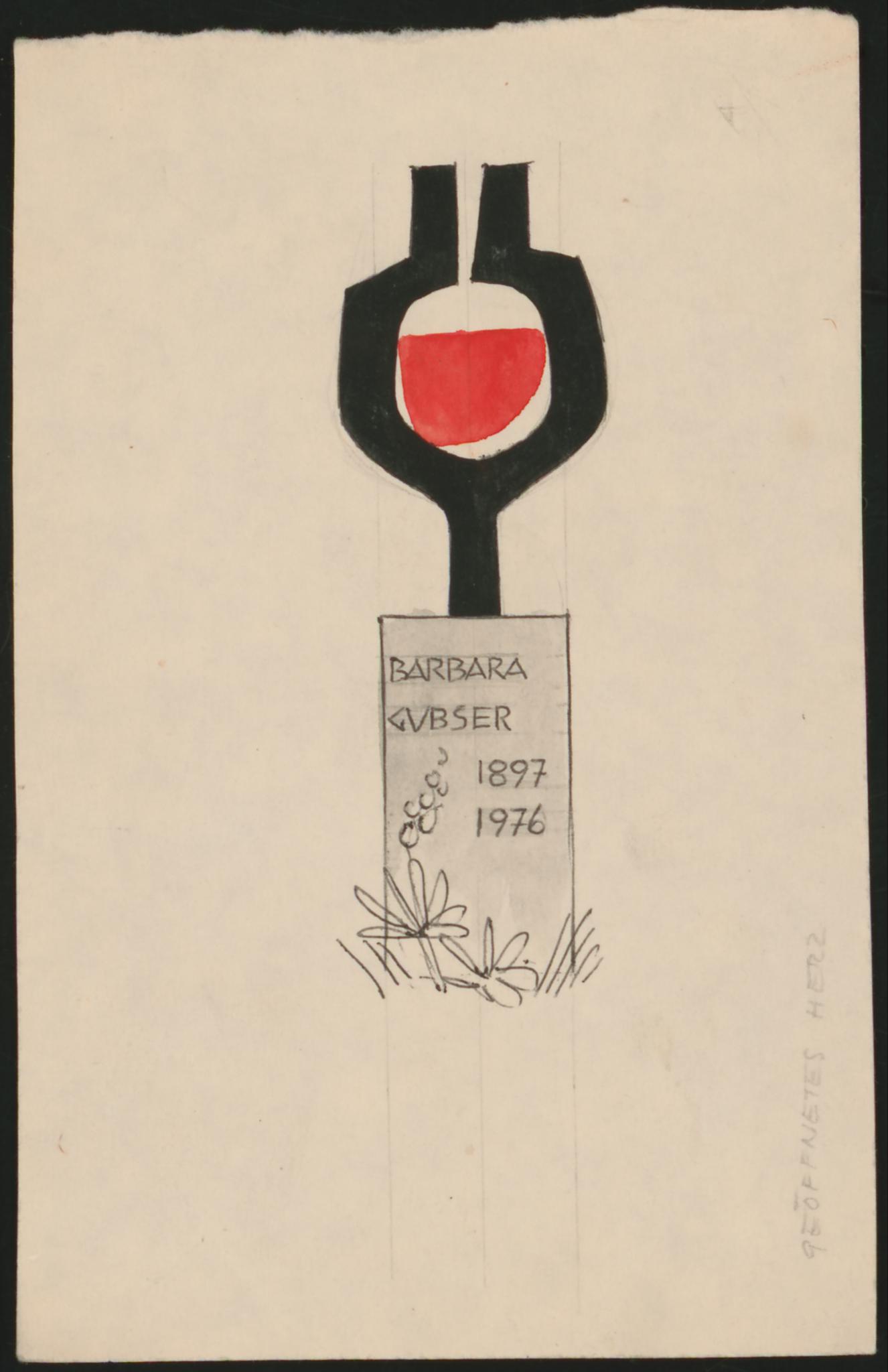 Die Zeichnung gehört zu einer dreiteiligen Entwurfsserie für einen Grabstein für Barbara Gubser (siehe auch HS_758). Eine Familienangehörige hatte um 1975 einen Grabstein für den Friedhof Arbon TG in Auftrag gegeben. Es ist unklar, ob der Grabstein realisiert und in Arbon aufgestellt wurde.