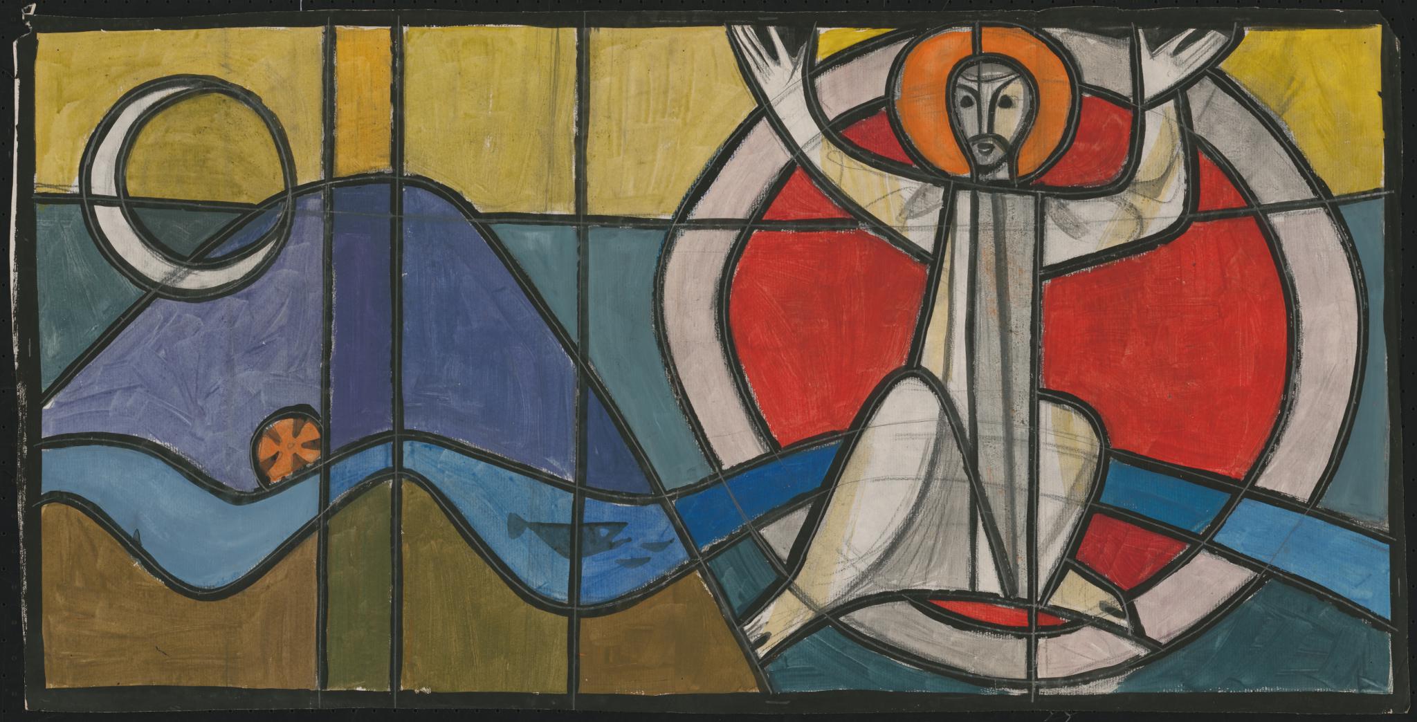 Von links sind der Sichelmond sowie ein Hügel, der sich über einen Fluss mit Fisch und Vegetation erhebt, dargestellt. In der rechten Bildhälfte wird der nimbierte Jesus Christus als Weltherrscher (Pantokrator) in einer zweifarbigen Mandorla gezeigt, der auf dem Fluss thront.