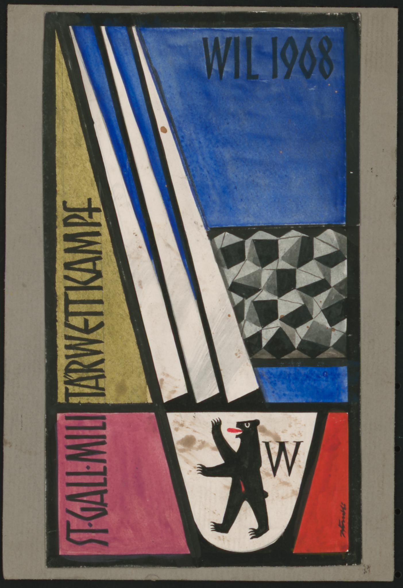 Farbiger Entwurf einer Wappenscheibe, die anlässlich des 1968 in Wil SG veranstalteten St. Galler Militärwettkampfs gestaltet wurde. Im unteren Bilddrittel steht das Wappen der Gemeinde Wil SG. Im oberen Bildraum sind drei weisse, spitz zulaufende Zacken vor einem polygonalen grauen Element, das an Panzersperren erinnert. Der Hintergrund ist in mehrere monochrome Flächen grafisch unterteilt.