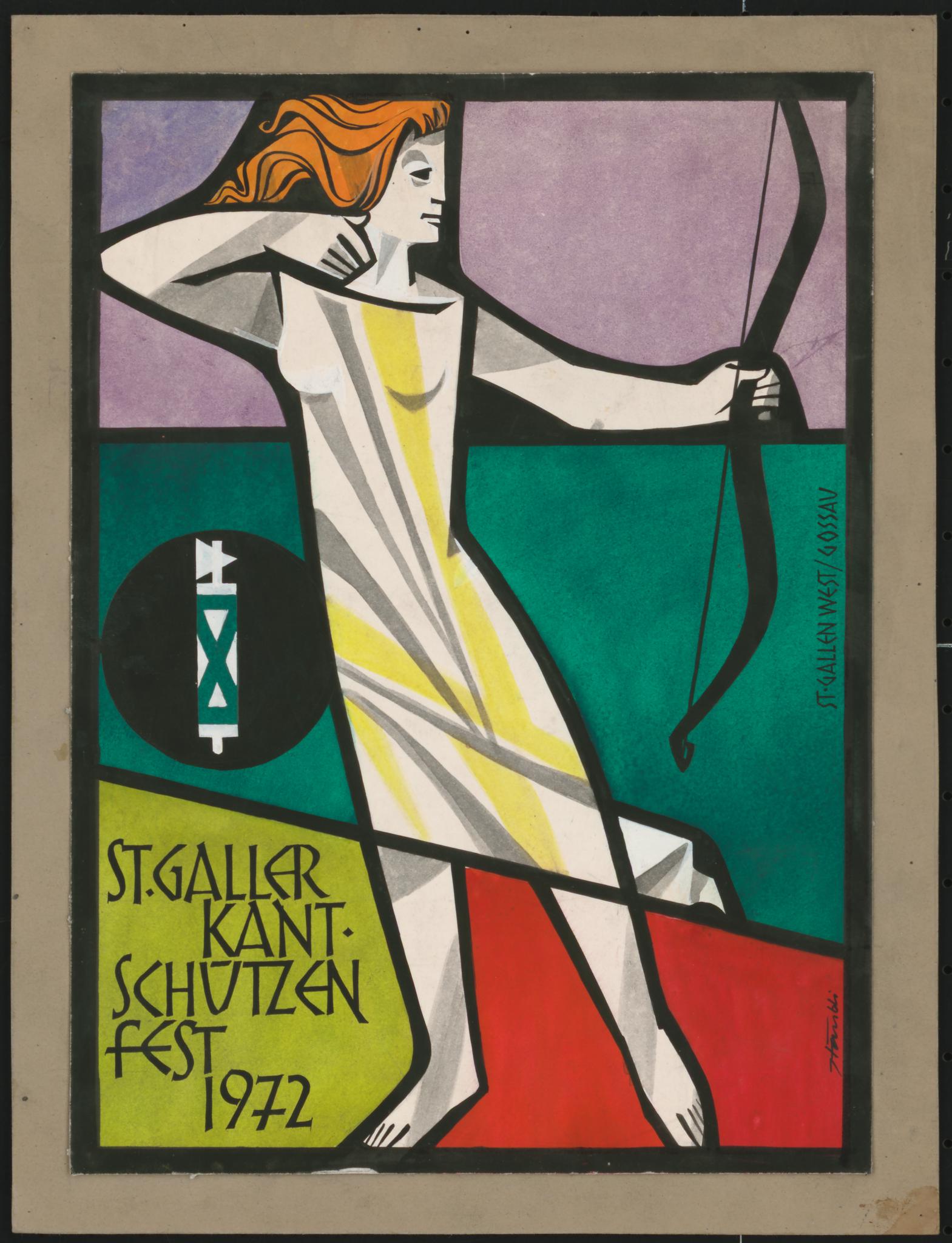 Farbiger Entwurf einer Figurenscheibe mit einer jungen Bogenschützin im Zentrum. Sie hat den Pfeil gerade losgelassen, ihre Arme verharren noch in Schusshaltung und die stilisierten roten Haare scheinen im Wind zu wehen. Links neben der Figur steht das runde Wappen des Kantons St. Gallen. Der Hintergrund ist in vier monochrome Farbflächen unterteilt.