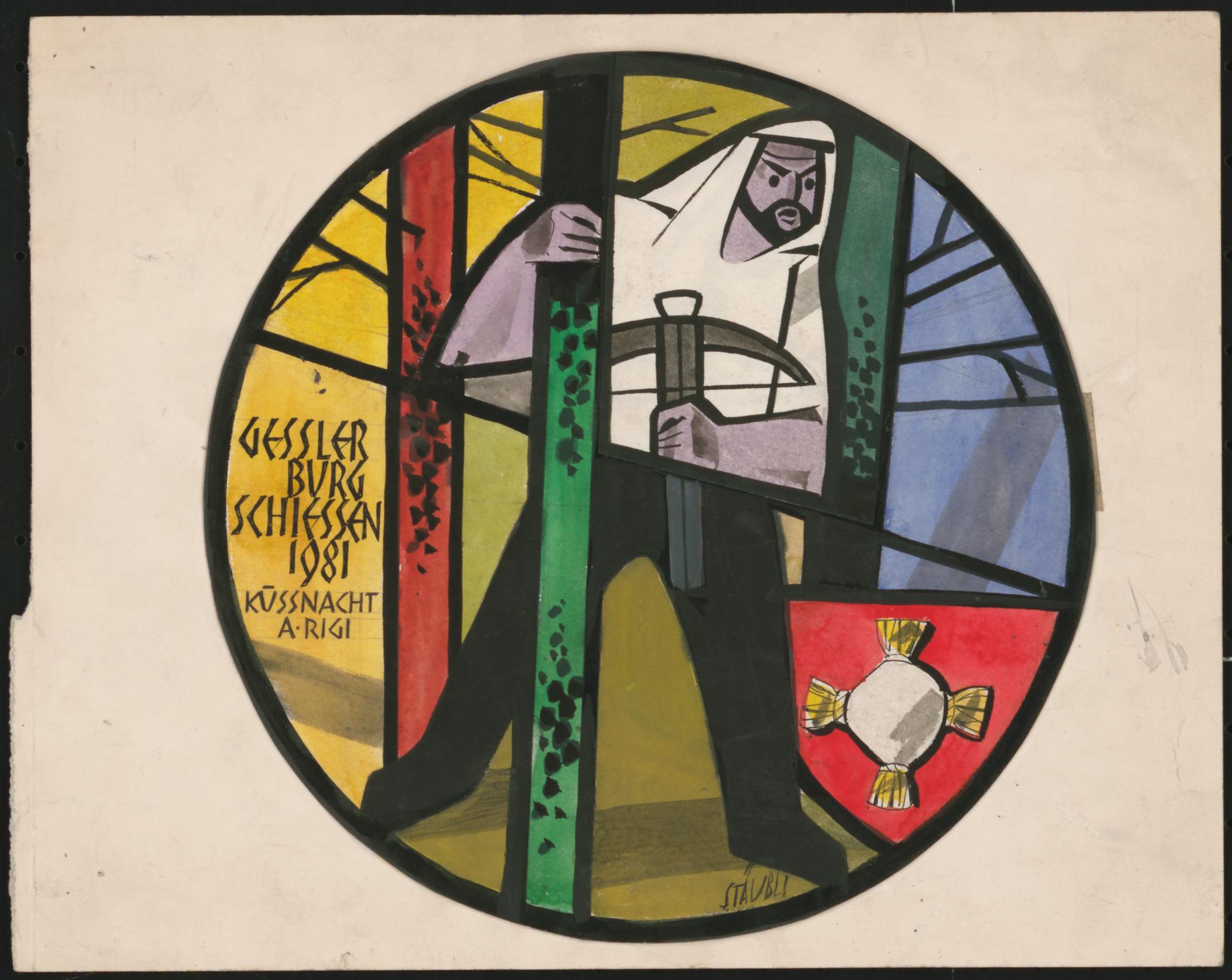Dieser Entwurf für eine Wappenscheibe wurde für den Armbrust-Schiess-Wettbewerb auf der Gesslerburg in Küssnacht am Rigi SZ im Jahr 1981 angefertigt. Typisch für die Wappenscheiben von Schiessvereinen wurde eine historische Darstellung eines Armbrustschützen gewählt, wie Kleidung und Waffe verdeutlichen. Im künstlerischen Nachlass hat sich eine Glasmalerei (VMR_10000) erhalten, die dasselbe Motiv zeigt, allerdings als rechteckige Wappenscheibe und mit zwei statt drei Bäumen. Möglicherweise entspricht der Entwurf einer früheren Fassung, die nicht ausgeführt wurde, oder einer Variation der Scheibe, die realisiert wurde.