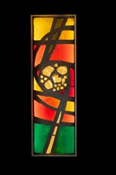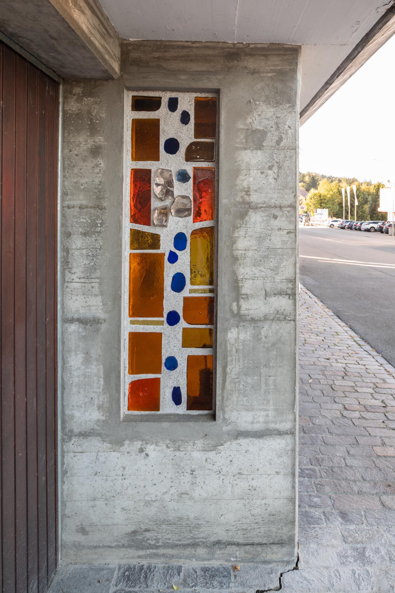 Vertikales Betonglasfenster bestehend aus grossen, flachen Gussglasstücken in Gelb- und Orangetönen. Eine breite Betonfuge verläuft mittig durch das Fenster, in die runde weisse und blaue Dallglasstücken, die teilweise kristallförmig zugeschlagen sind, eingelassen sind. Rückseitige befindet sich eine Vorrichtung für die elektrische Beleuchtung der Betonverglasung mittels einer einfachen Glühbirne.