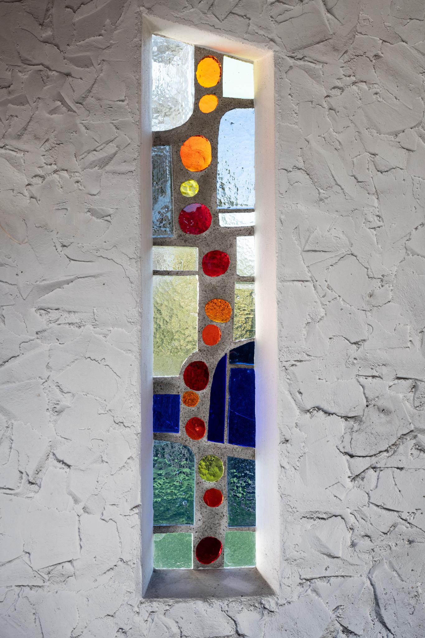 Längsrechteckiges Betonglasfenster mit abgeschrägter oberer Kante. Die Betonverglasung besteht aus grösseren Gussglasstücken in sehr hellen Gelb-, Blau- und Grüntönen; die Farbanordnung von oben nach unten (hell-weiss, gelb und blau bis zu grün) greift dabei die Farben der Landschaft (Sonne, Himmel, Garten) auf. Eine breite vertikale Betonfuge, die mit runden gelben, orangefarbenen und roten Dallglasstücken versehen ist, zieht sich mittig durchs Fenster.