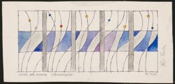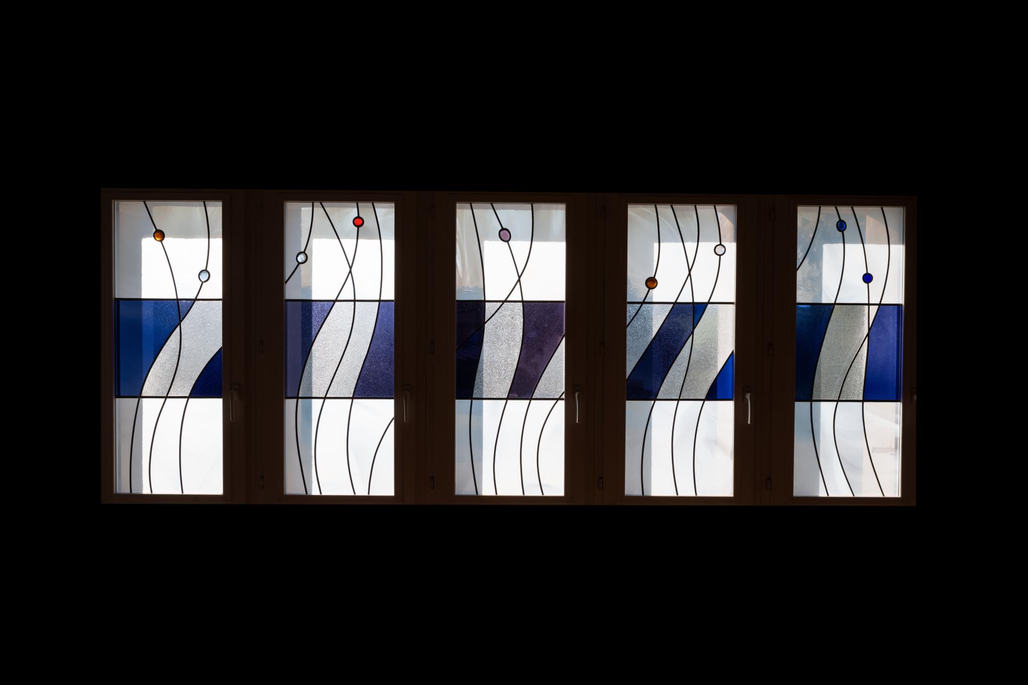 Fünffenstrige Ornamentverglasung aus Farb- und Blankglas. Jedes Fenster ist durch horizontale Bleie in drei gleichgrosse Flächen unterteilt, mit opakem weissem Glas im oberen und unteren Feld. Das mittlere Feld aus blauem Glas wird durch ein oder zwei Bänder aus stark gebläseltem Blankglas aufgebrochen. Die Bänder folgen dem Verlauf der gekrümmten vertikalen Bleie, die als lineares vertikales Muster jedes Fenster durchziehen und im oberen Drittel des Fensters mit rundgeschliffenen farbigen Dallglaspunkten besetzt sind.