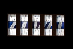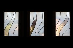 Ornamentverglasung bestehend aus vier vertikal gestaffelten Fenstern, die von horizontalen Bleien in jeweils vier unterschiedliche hohe Felder unterteilt werden. Von unten nach oben ziehen sich fortlaufende gekrümmte und vegetabile Formen aus Farbglas, die sich vom umgebenden opaken weissen Glas absetzen. Als regenbogenartiger Farbverlauf gehen die dunklen grünen Tönen in Blau und Lila bis in Rot- und Orangetönen über. Es entsteht der Eindruck einer der Sonne entgegenwachsenden Pflanze. Im obersten und untersten Fenster gibt es je eine blankverglaste Scheibe.