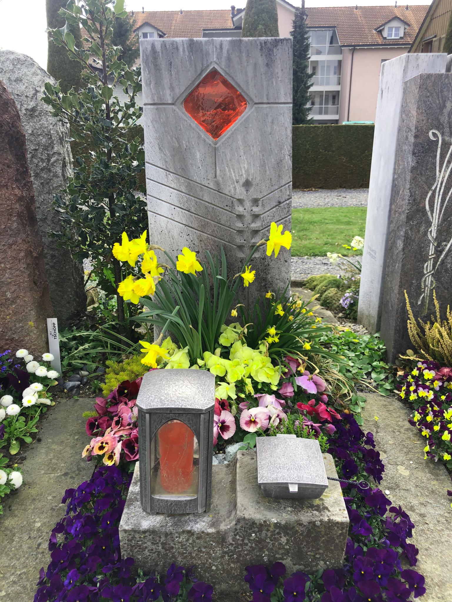 Grabstein aus grauem Naturstein mit rotem Dallglas in Rautenform im oberen Drittel. Das Gussglas ist grob behauen und das leuchtende Rot setzt sich prominent vom grauem Stein ab. Auf halber Höhe des Grabsteins ist eine Weizenähre im Relief angebracht.