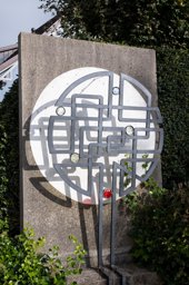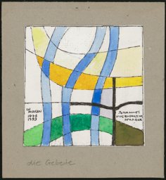 Quadratische Scheibe mit abstrakter Komposition aus orangefarbenen und grünen Bogenformen, dazwischen ein schwarzes Kreuz. Möglicherweise vegetabile Formen, die aus einem braunen Saatkorn spriessen, darüber die Sonne.