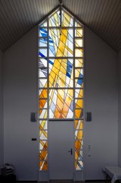 Das Rundfenster in der kleinen Kapelle des Altersheims in Degersheim liegt gegenüber einer zweiten raumgreifenden abstrakten Verglasung des St. Galler Glasmalers Heinrich Stäubli (HS_1052). Im Nachlass des Ateliers Stäubli hat sich ein Entwurf erhalten, der eine Variation der rosa-weissen Ornamentverglasung zeigt (HS_407).