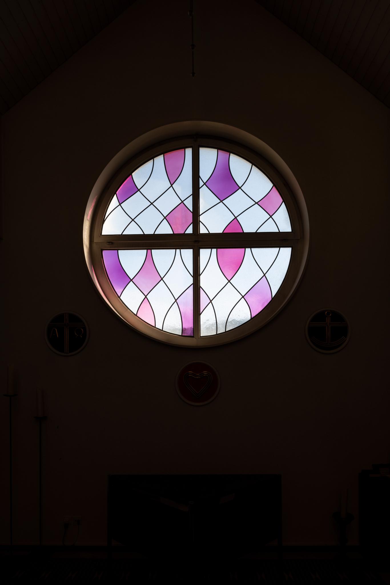 Rundfenster mit kreuzförmigen Sprossen und Ornamentverglasung aus vertikalen, sich kreuzenden Wellenlinien, dazwischen Flächen in rosafarbenem und opakem weissen Glas.