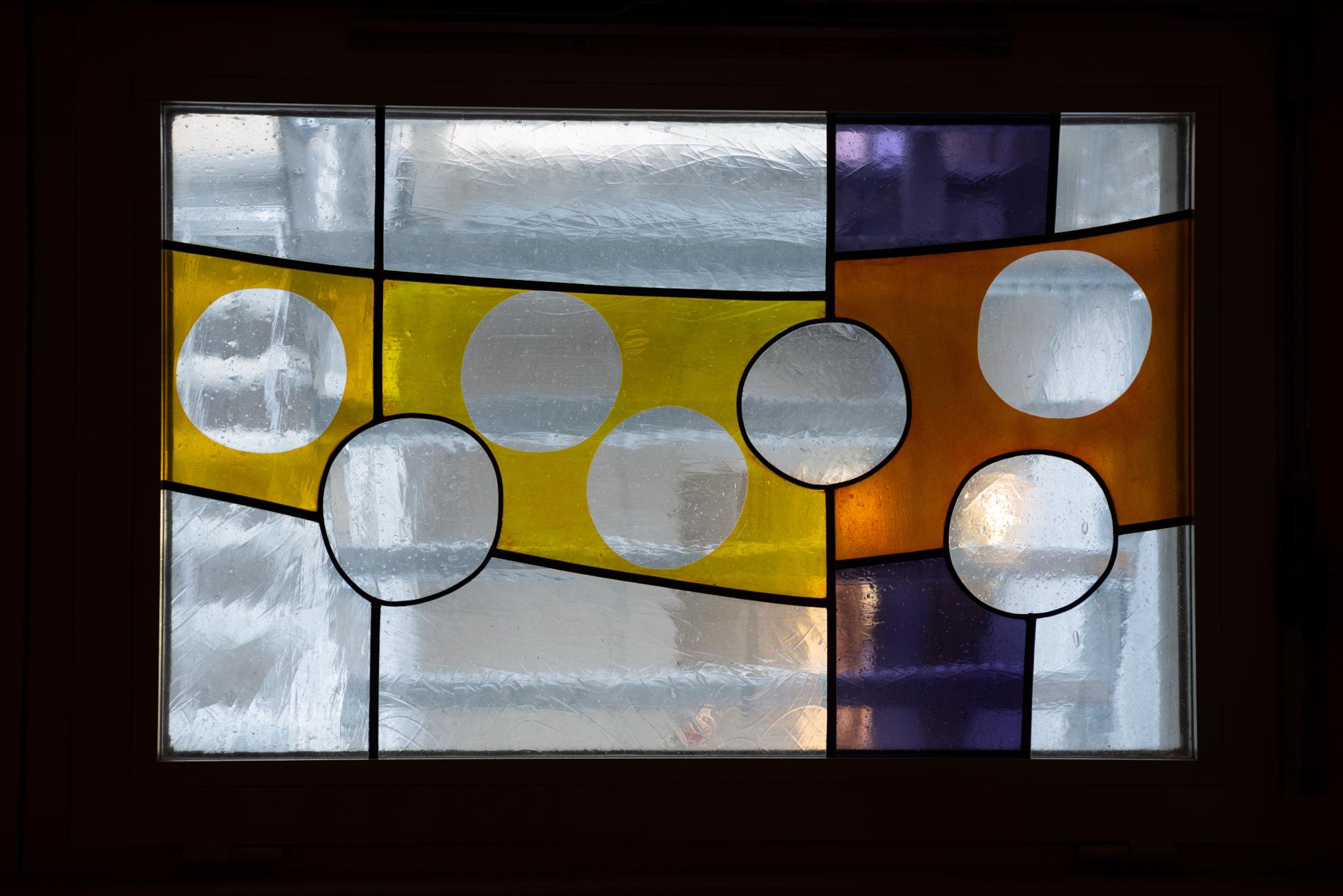 Recheckiges Fenster mit einem horizontal verlaufenden gelb-orangefarbenen Band, das von einer violetten Fläche in der rechten Bildhälfte gekreuzt wird. Vor dem Band heben sich mehrere Kreise aus farblosem Glas ab. Teilweise sind die Kreise aus dem farbigen Überfangglas ausgeschnitten, teilweise als bleigefasste Glasstücke eingesetzt (im Foto erscheinen sie als dunkel umrandet). Das farblose Glas weist einen starken Hobel bzw. Bläselung auf.
