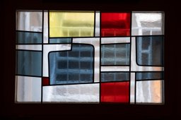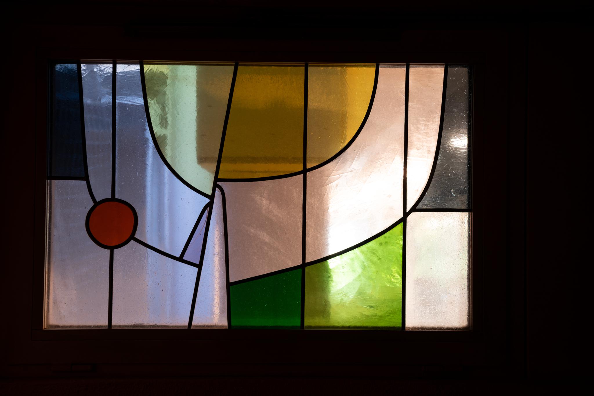Rechteckiges Fenster mit gelbem und farblosen Halbkreis (Sonne) im Zentrum. Daneben geometrische Aufteilung der Fläche durch rasterartige Bleiruten und einzelne Farbflächen in Grün, Grau und Blau mit rotem Punkt.