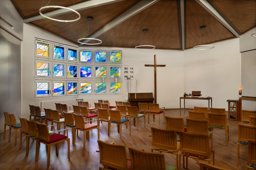 Die Glaswand über Eck im Kirchenraum der evangelischen Kirche Steinach war mit einer bauzeitlichen Fensterverglasung aus farblosem Strukturglas ausgestattet, allerdings bereits in derselben Anordnung der insgesamt 18 quadratischen Scheiben. In den späten 1980er Jahren wurden mehrere Schritte zur Erweiterung- und Renovierung des Kirchgemeindezentrums unternommen. Am 18. September 1988 weihte die Gemeinde zunächst einen freistehenden Glockenträger mit vier Glocken ein. In dieser Zeit lief bereits die Planung für eine neue Farbverglasung für den Kirchenraum, die vom Atelier Stäubli ausgeführt werden sollte (Protokolle Kirchenvorsteherschaft, 30.8.1988; 27.9.1988; 29.11.1988). Heinrich Stäubli hatte dazu einen farbigen Entwurf eingereicht, der sich im künstlerischen Nachlass erhalten hat (HS_9). Zur Finanzierung der 18-teiligen Verglasung wurden die einzelnen Scheiben zu je 1'000 Franken «verkauft», u.a. stifteten die Raiffeisenbank Steinach, der Evangelische Frauengruppe und Privatpersonen eine oder mehrere Scheiben. Im November 1988 waren bereits vierzehn Scheiben verkauft (Protokoll 29.11.1988). Im Gottesdienst vom 4. Juni 1989 wurde die neue farbige Verglasung von Heinrich Stäubli schliesslich eingeweiht (Protokoll 27.5.1989).