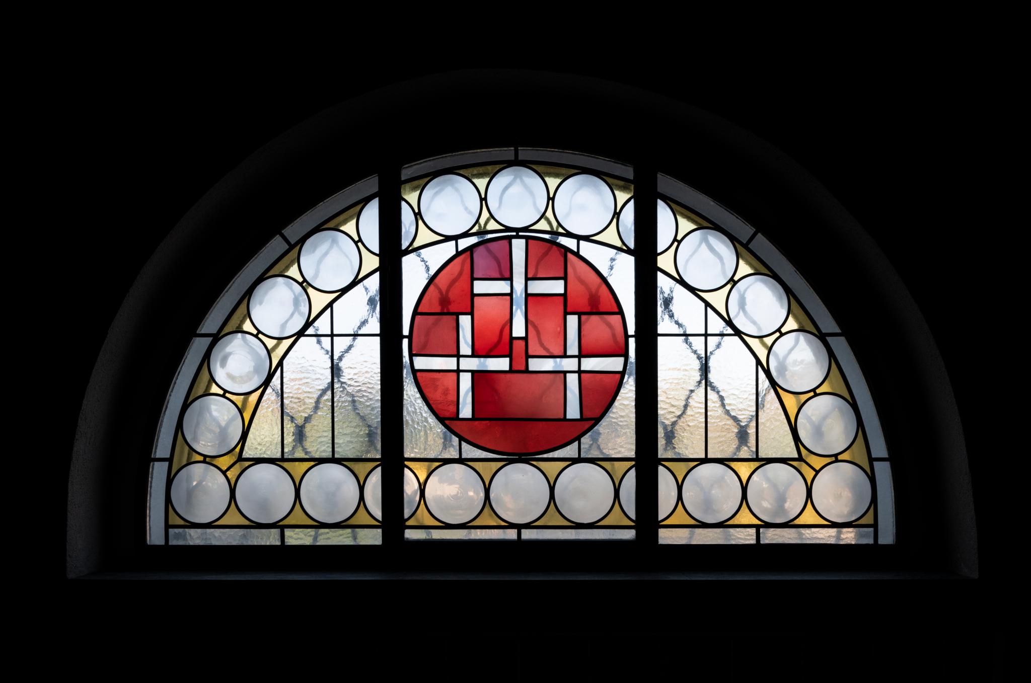 Flaches, dreigeteiltes Rundbogenfenster mit drei weissen Kreuzen in einer roten Kreisform, als Symbol für die Kreuze auf dem Hügel Golgatha und die Kreuzigung Christi. Das Fenster besteht aus farblosem Strukturglas und einem breiten umlaufenden Ornamentband aus opak weissen Kreisen auf gelbem Grund.