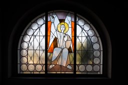 Flaches, dreigeteiltes Rundbogenfenster mit dem Christusmonogramm (Alpha und Omega als blaue Buchstaben in gelb-oranger Kreisform). Das Fenster besteht aus farblosem Strukturglas und einem breiten umlaufenden Ornamentband aus opak weissen Kreisen auf violettem Grund.