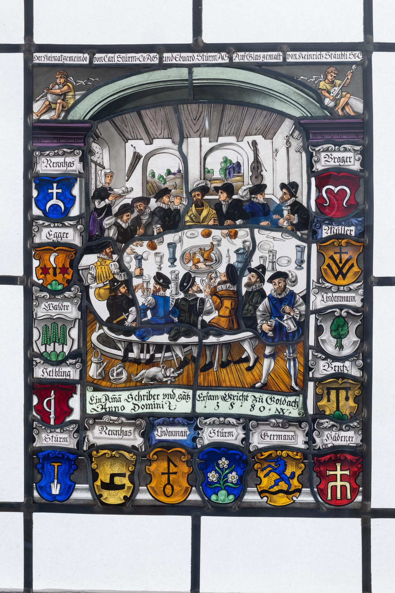 Wappenscheibe mit der historisierenden Darstellung eines Festmahls des Gerichts von Goldach: In einer Stube mit teils offenen (nicht verglasten) Rundbogenfenstern, teils Butzenfenstern sitzen dreizehn Männer um einen runden, reich gedeckten Tisch. Ein Mann steht im Vordergrund und schenkt sich aus einer Kanne nach. Ein Hund sowie leere Gefässe liegen auf dem Holzboden. Im Hintergrund bringt eine Magd Speisen an den Tisch. Die Szene ist von einer Arkade in Untersicht gerahmt, oberhalb der Kapitelle sitzen musizierende Putten. An den Arkadenpfeilern und am unteren Bildrand sind die Wappen und Inschriftenkartuschen von Goldacher Geschlechtern angebracht.