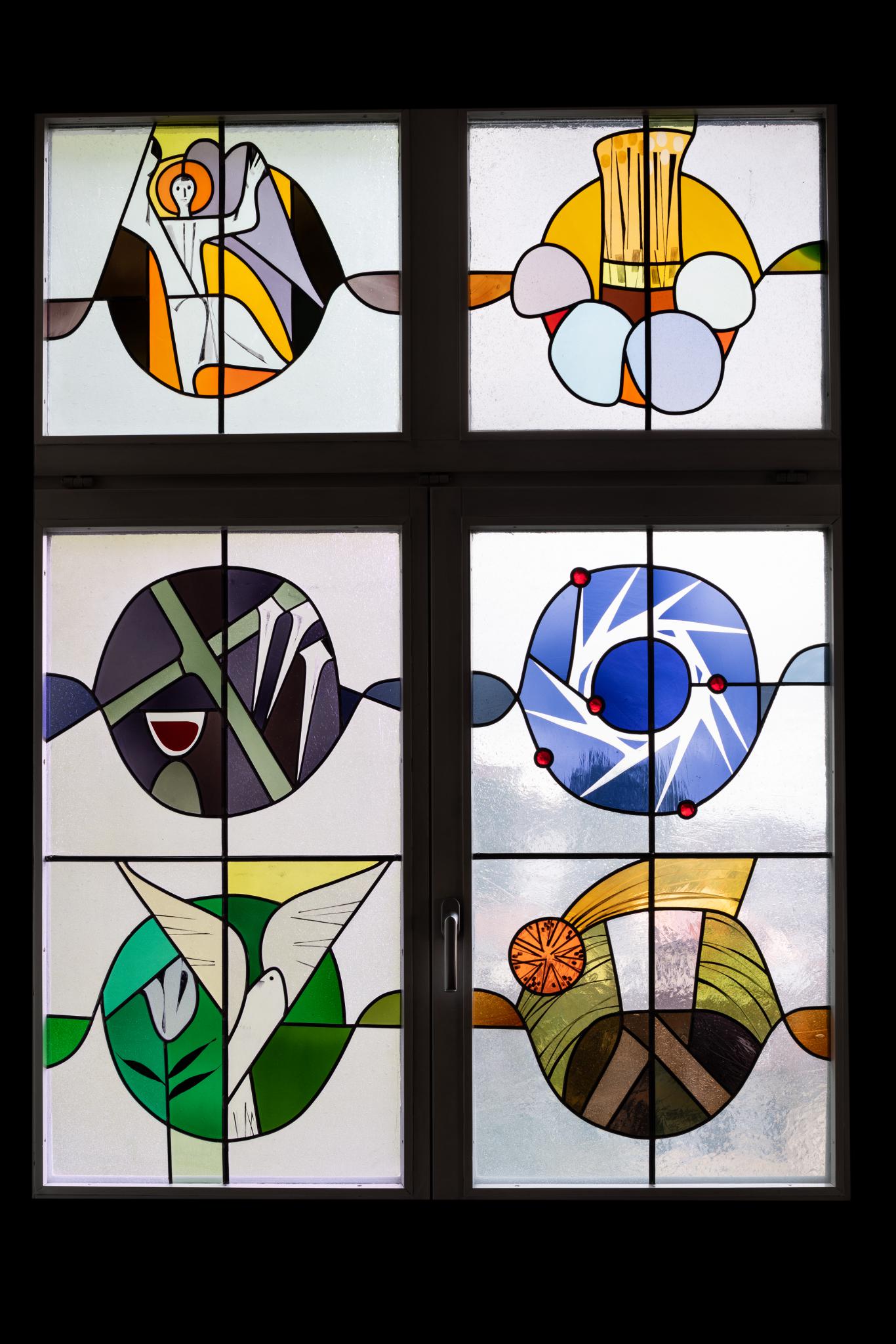 Im Juli 1987 setzten Stäubli und sein Mitarbeiter Ernst Holenstein die zwei Fenster ein, wie historische Aufnahmen zeigen (Früh, 1987, o. S.). 1996 brachten Stäubli und Holenstein eine dritte Glasmalerei im Chorbereich hinter dem Altar an, das eine Verkündigungsszene zeigt (HS_1083) und sich damit gut in das bestehende Bildprogramm einfügt. Dieses Fenster ist nicht bauzeitlich im Planbestand eingezeichnet.