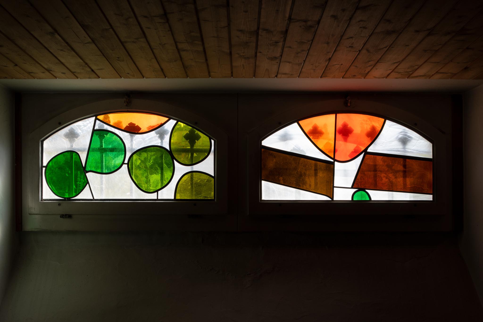 Dreiteiliger Zyklus von seitlich gerade abgeschlossenen Segmentbogenfenstern mit einer abstrakter Komposition aus Punkten und Balken in Grün-, Orange-, Gelb- und Brauntönen auf opakem weissem Grund. Das Glas ist stark gehobelt. (In der fotografischen Aufnahme ist an einigen Stellen der vor dem Fenster befindliche Zaun zu sehen.)