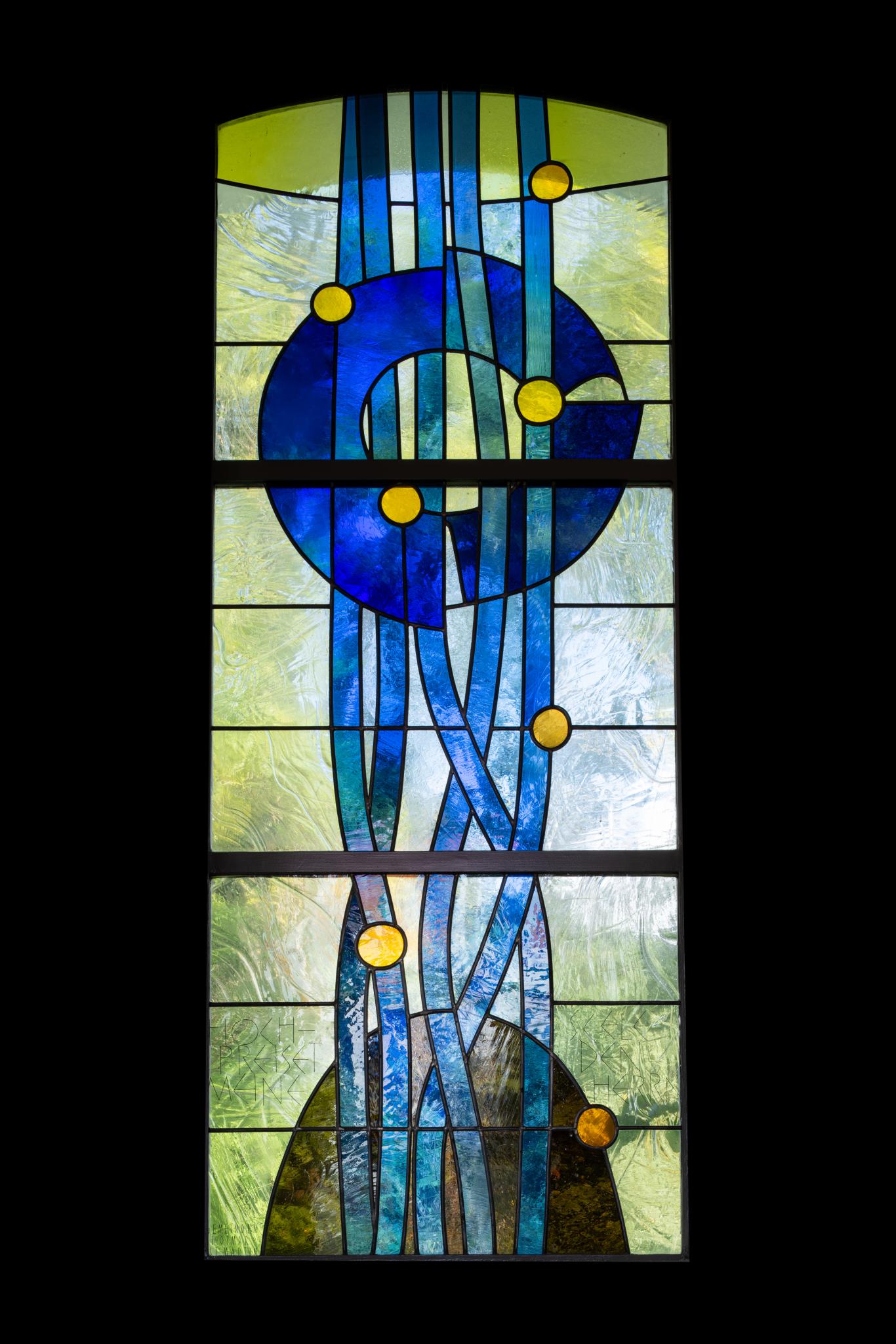 Zweifach horizontal unterteiltes Segmentbogenfenster mit der Darstellung von Regen (dünne blaue Bänder), dem Mond (blauer Kreis), den Sternen (gelbe Punkte) und der Erde (brauner Hügel) auf farblosem Grund. Auffallend ist der ausgeprägte Hobel bzw. die Bläselung des verwendeten farbigen und farblosen Echtantikglases.