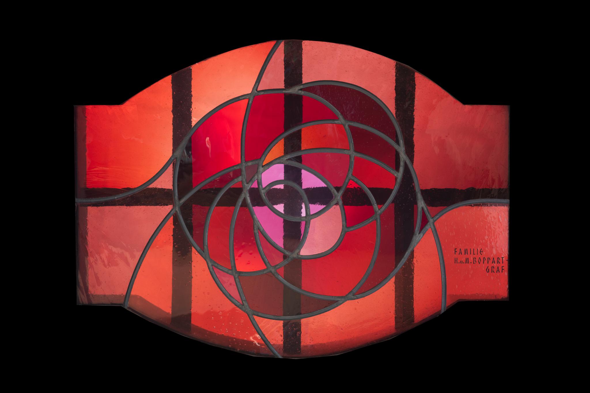 Kartuschenförmiges Fenster aus unterschiedlichem rot durchgefärbtem Glas. Die spiralförmig von aussen nach innen verlaufenden Bleiruten bilden eine Rose, als Teil einer Mariensymbolik.
