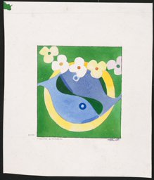 Quadratische Glasmalerei zum Thema des Ehesakraments: Vor dunkelgrünem Hintergrund vereinen sich zwei blaue Fische, umgeben von einem goldenen Ring. Ein rotes Kreuz gliedert den Bildraum, zu dem eine breite vertikale Metallsprosse (anstelle eines Windeisens) parallel verläuft, und segnet damit die Eheschliessung. Im oberen Drittel hängt eine Girlande aus weissen Kugeln mit bunten Verzierungen, wofür Überfangglas verwendet wurde, als Zeichen der Früchte der Ehe.