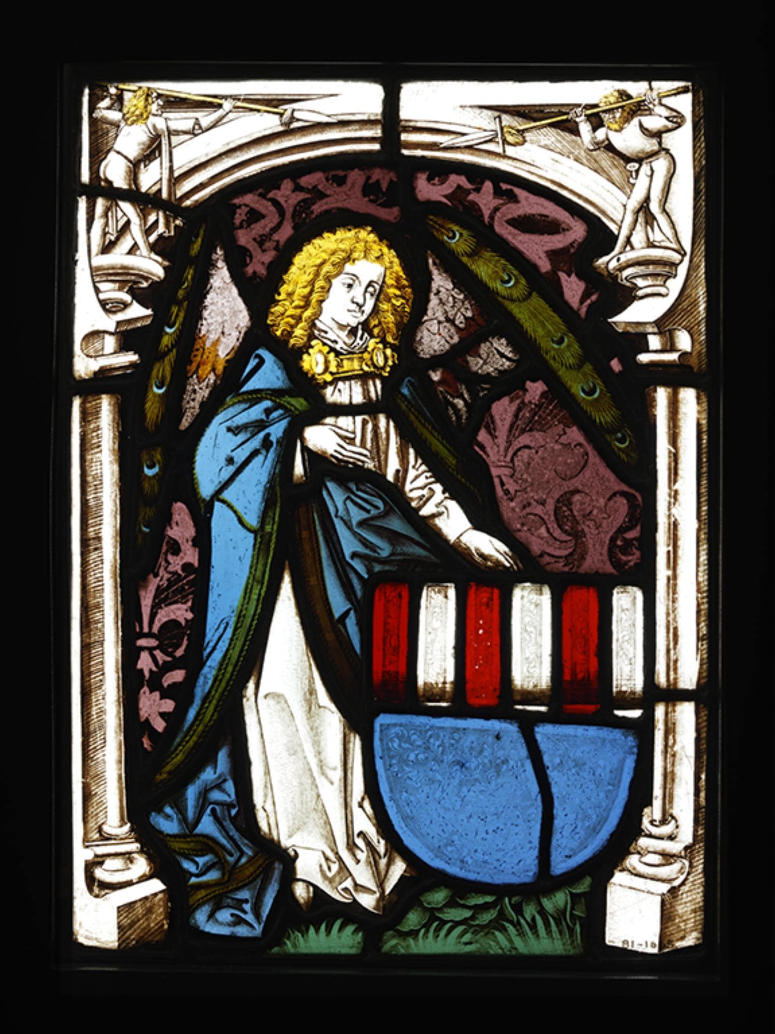 Les armes représentées dans ce panneau ont été identifées en 1923 par Hans Lehmann comme étant celles des von Krenkingen (V&A, documentation, état du 20 décembre 2021). Famille de barons connue du XIIe au XVe siècle, les Krenkingen possédaient le château du même nom dans le Klettgau. C'est vers 1200 que la famille connut son plus grand rayonnement, lorsque lui fut octroyée l'avouerie du couvent de Rheinau, probablement sous l'influence de Diethelm, évêque de Constance. La famille se scinda ensuite en deux branches. Jusqu'à son extinction en 1418, la lignée des Alt-Krenkingen eut comme sièges les châteaux de Gutenburg et de Tiengen, tandis que les Weissenburg-Krenkingen administrèrent leurs biens depuis Weissenburg (bien du couvent de Rheinau) près de Waldshut, jusqu'au moment où, vers 1300, la pression des Habsbourg les contraignit à se retirer à Roggenbach (commune Bonndorf, Forêt-Noire). En 1482, Elisabeth, abbesse du Fraumünster de Zurich, vendit l'héritage de sa famille, soit la seigneurie de Roggenbach, aux comtes de Lupfen (Leonhard 2005, consulté le 23 mars 2021).
