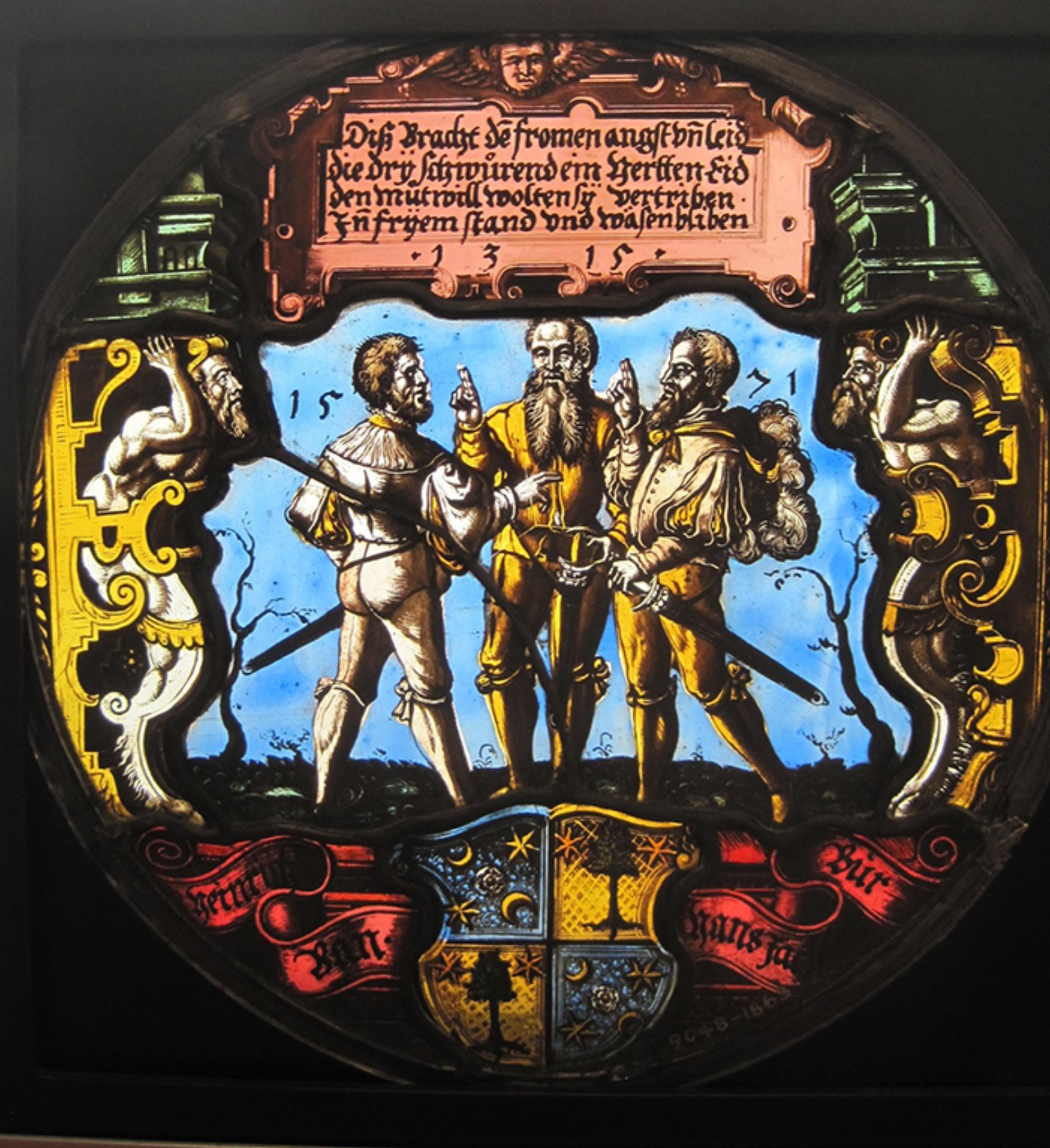 Vitrail historié aux armes de Heinrich Ban et Hans Jakob Baur : le serment du Grütli