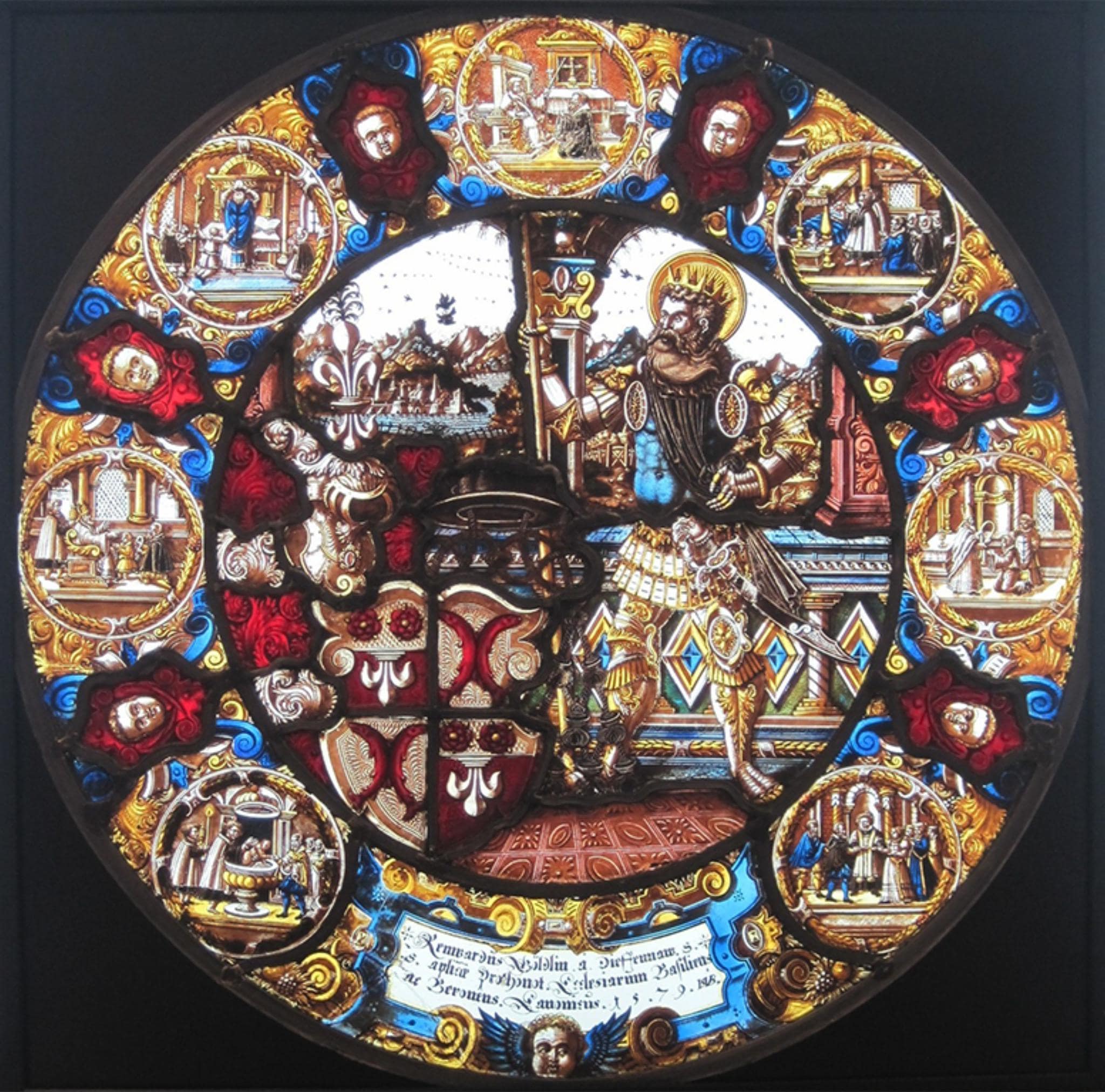 L’emplacement d’origine du vitrail de Londres n’est pas établi. Sa datation de 1579 pourrait toutefois avoir un lien avec son ordination en 1578 au titre de chanoine, ce que semble rappeler le chapeau de dignité orné de cordons se terminant par six houppes réparties sur trois rangées, représenté dans le vitrail.